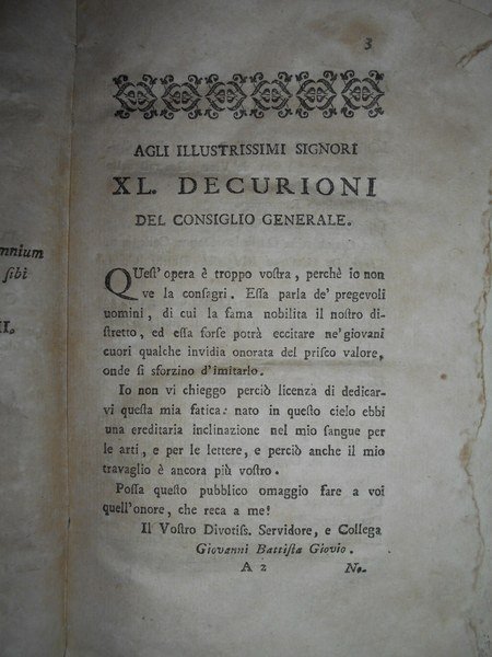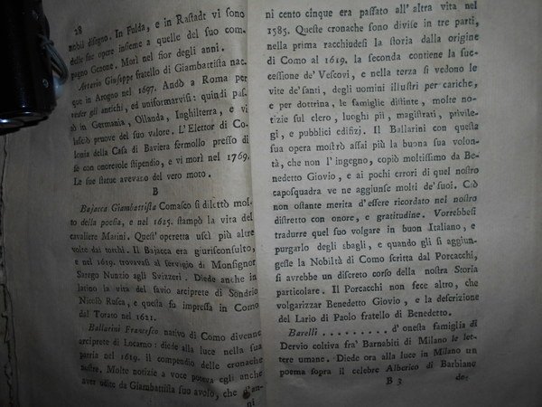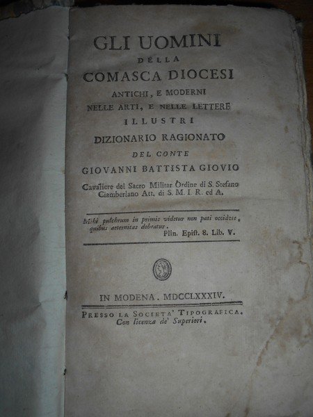 (Como) Giovanni Battista Giovio. In Modena, Presso La Società Tipografica, 1784. Gli Uomini della Comasca Diocesi. Antichi e moderni nelle arti, e nelle lettere illustri dizionario ragionato del Conte Giovanni Battista Giovio. In-8°, cartone coevo. 1 f. bianco, 489 pp., 3 ff. bianchi. Esemplare ben conservato in barbe. Edizione originale. Cas.