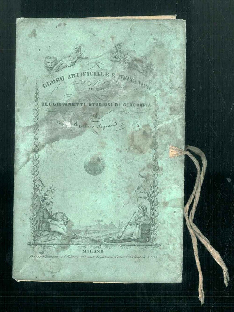 <p>19 cm, cartella editoriale completamente illustrata, chiusura con nastri, un cartoncino esplicativo inciso fronte retro a colori acquarellati, un globo ripiegato a 6 spicchi di carte geografiche colorate a mano legati da cordoncini con fermagli. Il cartoncino illustrato riporta sulle due facciate il "Meccanismo del Gllobo artificiale" e lo "Zodiaco ecclittico". Prima e quarta copertina illustrate da raffinate incisioni, alla prima cop. titolo in grande cornice allegorica con diverse figure, all'ultima cop. la raffigurazione dello zodiaco ed alcune note esplicative "L'oggetto di questo piccolo meccanismo è di presentare, come un trastullo, la cognizione e la forma della Terra, e di dare una piena idea della sua divisione fisica e politica." ; "Nota: Il Globo s'arrotonda disponendo in giro i foglietti, poi si riuniscono alto e basso facendo scorrere i fermagli sui cordoncini; il globo così disposto." Il Globo è perfettamente conservato, tracce d'uso ed aloni alla prima copertina, esemplare privo dell'opuscolo di 16 pagine segnalato dai repertori. Rara prima edizione italiana del globo meccanico di Legrand che non riporta l'anno di stampa a differenza delle edizioni successive.</p>