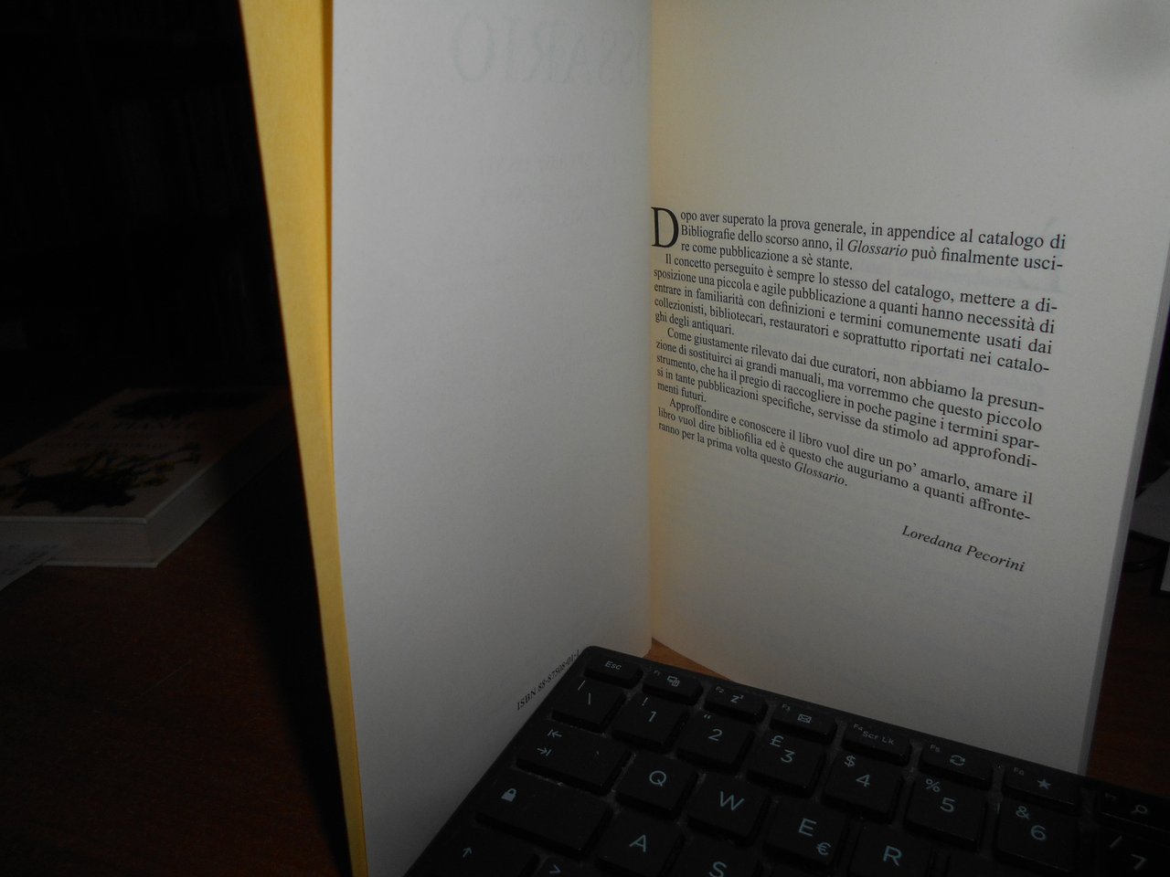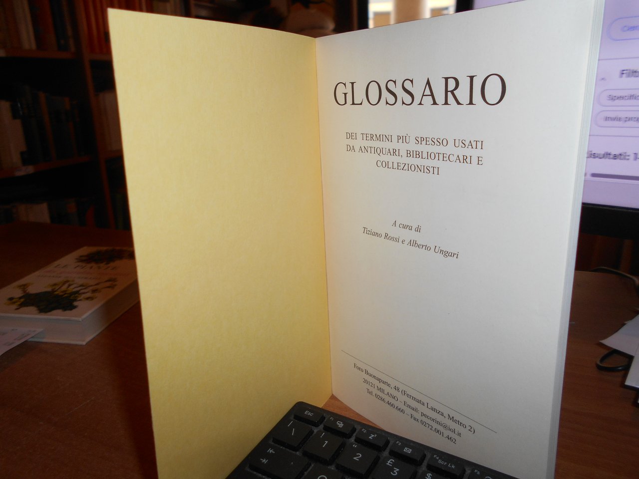 Glossario PECORINI dei termini più spesso usati da Antiquari, Bibliotecari e Collezionisti. In-16° grande, cart. edit. 102 pp. Come nuovo. Neg. lett. mod. mob. E