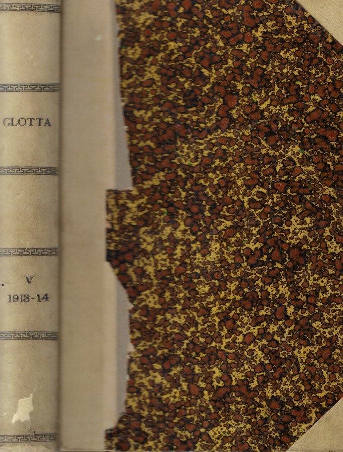 Annata completa, vol. V, rilegata in un unico volume, della pubblicazione mensile per la lingua greca e latina e così composta: n. 1/2-3-4 rispettivamente di aprile (numero doppio)-ottobre 1913 e maggio 1914. Mezza legatura con angoli in pergamena e piatti marmorizzati, con titoli in nero solo al dorso, leggermente brunita e segnata dal tempo, con alcune piccole abrasioni e mancanze . Pagine lievemente ingiallite, salde, con ampio margine e note al piede. Ciascun numero con coperta editoriale in cartoncino Numero complessivo pagine 398 con numerazione consecutiva.