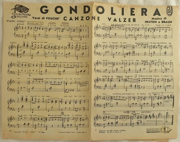 Partitura per orchestra del 1935 delle melodie "Gondoliera" di Helton e Braun e "Se non ti va." di Fiorita. Copertina assente. GENERE: Valzer STRUMENTI: pianoforte, violino, cello, contrabasso ANNO: 1935 DIMENSIONI: In 8. cm 27x17,5 PAGINE: pp. 10 CONDIZIONI: Buone condizioni. Score for orchestra of 1935 of the melody "Gondoliera" by Helton e Braun and "Se non ti va." by Fiorita. Editorial cover lacks. MUSIC:Polka STRUMENTI: piano, violin, cello, contrabass YEAR: 1935 SIZE: In 8. cm 27x17,5<BR>PAGES: pp. 10 Good conditions