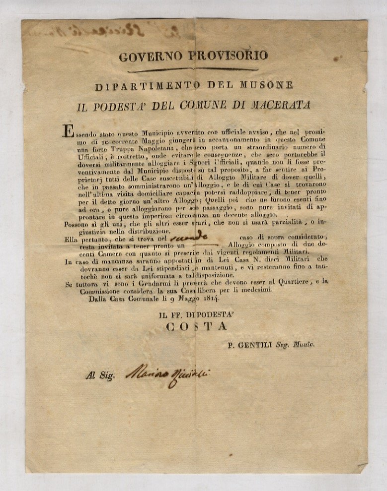 Governo Provisorio [sic]. Dipartimento del Musone. Il podestà del Comune di Macerata. Essendo stato questo Municipio avvertito con ufficiale avviso che nel prossimo dì 10 corrente Maggio giungerà [.] in questo comune una forte truppa napoletana [.] il doversi militarmente alloggiare i Signori Ufficiali [.] Ella pertanto [.] resta invitata a tenere pronto un Alloggio composto di due decenti camere con quanto si prescrive dai vigenti regolamenti militari [.]. Dalla Casa Comunale li 9 maggio 1814. Il F.F. di Podestà Costa.