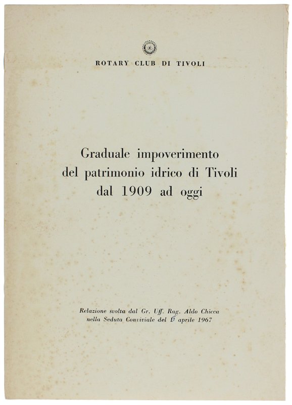 GRADUALE IMPOVERIMENTO DEL PATRIMONIO IDRICO DI TIVOLI DAL 1909 AD OGGI. Relazione svolta dal Gr. Uff. Rag. Aldo Chicca nella Seduta Conviviale del 6 aprile 1967. | Libri antichi e moderni | Chicca Aldo.