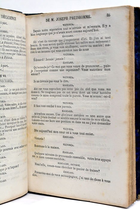 108 pages. (17,5x11,5 Cm). Demi-basane de l'époque. Dos lisse orné. Coins et coiffes émoussés. Plats frottés. Chef-d'œuvre de l'écrivain et dessinateur Henri Monnier. Notre exemplaire offert par Henri Monnier, comporte un envoi autographe au crayon, daté de 1865, "à M. Bax" et une lettre autographe signée, de la même date, conçue en ces termes: "La plus belle fille, mon cher Directeur ne peut offrir, daignez m'épargner le reste. C'est pourquoi je vous dédie ce dernier exemplaire de M. Prudhomme. Ce n'est pas mon dernier ouvrage, mais c'est ce que j'ai fait de mieux. Et voilà! Votre dévoué. Henri Monnier." Envoi d'Amédée Bax sur un feuillet de garde. Monnier avait esquissé le type de "Joseph Prudhomme" dès 1830 dans un recueil de dessins, avant de lui donner sa physionomie définitive et d'en faire un personnage littéraire et le protagoniste de cette pièce de théâtre. Sur la scène il jouait lui-même le rôle de Prudhomme. Rousseurs.