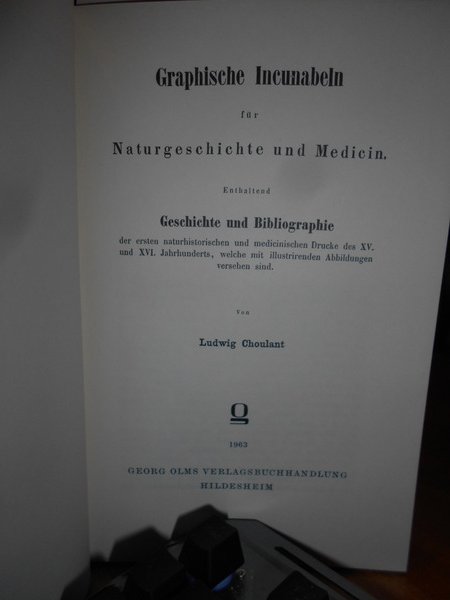 LUDWIG CHOULANT. Hildesheim, Georg Olms, 1963. Graphische Incunabeln fur Naturgeschichte un Medizin. In-8° piccolo, cartonato edit. con titoli al dorso e sul piano. xx, 168 pp. Come nuovo. Uff. D - II - 5 - 2