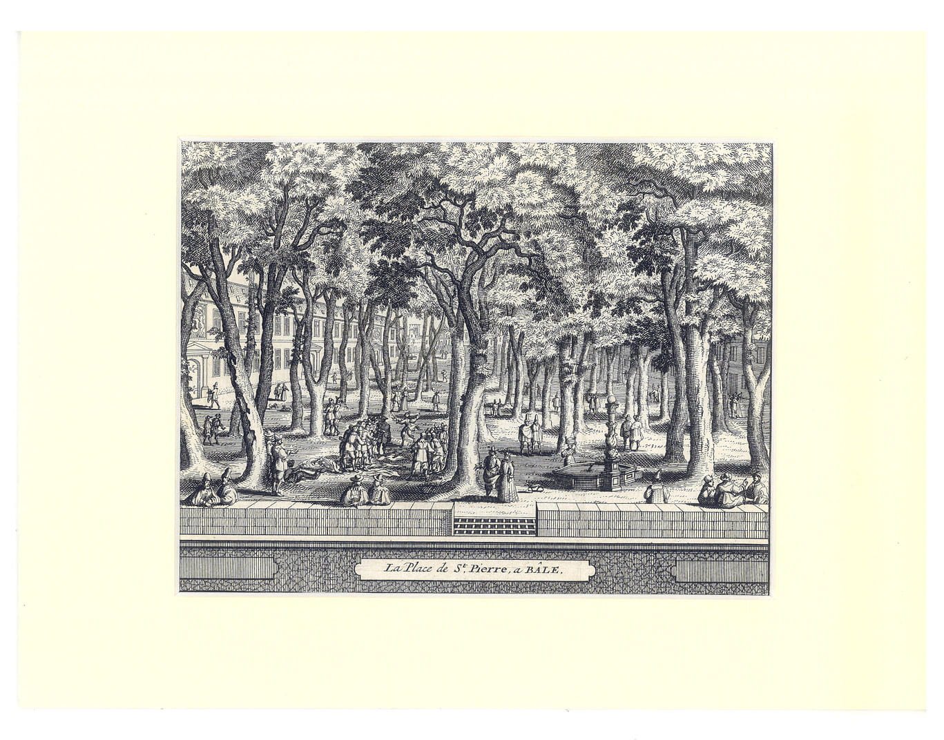 GRAVURE D'UNE VUE du XVIIe de la place de Saint-Pierre à Bâle en Suisse