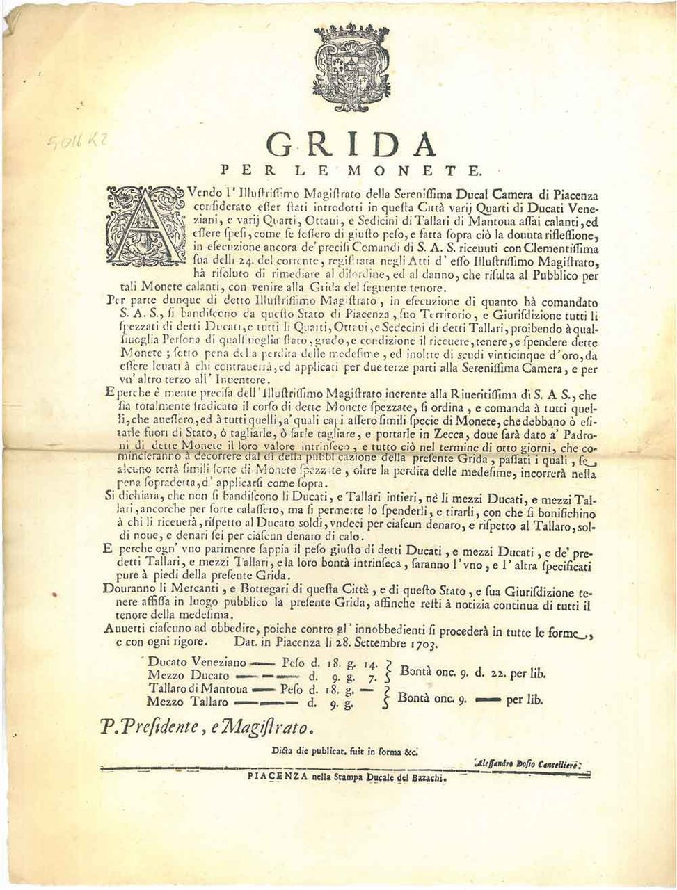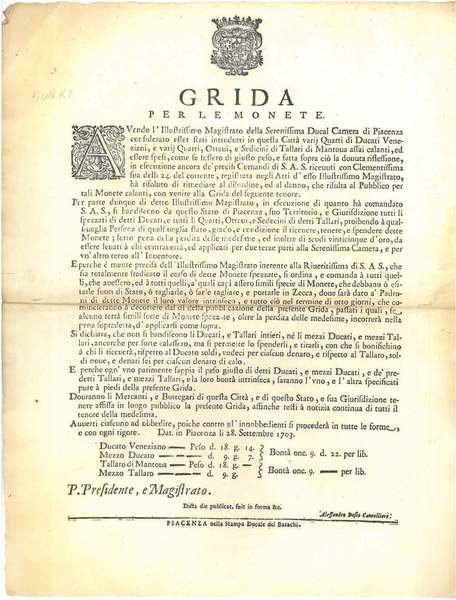 38x30 cm, stemma ducale grande capolettera ornato, 35 righe di testo più 4 righe relative al ducato veneziano, al mezzo ducato, al tallaro di Mantova e al mezzo tallaro. Piegatura per spedizione
