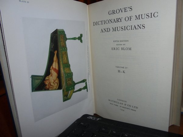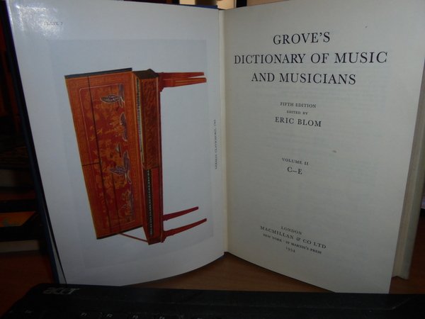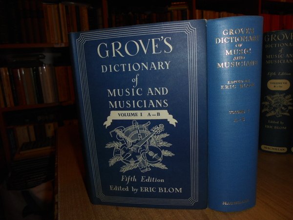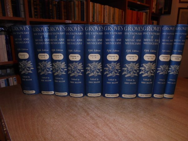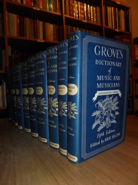 Edited by ERIC, BLOM. London, MacMillan & Co LTD, New York, 1954/1961 (supplementary volume). GROVE'S DICTIONARY OF MUSIC AND MUSICIANS fifth edition. 10 volumi in-8°, tela azzurra con titoli in oro nei dorsi e sovracopertine. Vol. I. xxxviii, 1078 pp. e 6 tavole f.t.; Vol. II. 996 pp. e 13 tavole f.t.; Vol. III. 864 pp. con 3 tavole f.t.; Vol. IV. 881 pp. con 17 tavole f.t.; Vol. V. 1048 pp. con 3 tavole f.t.; Vol. VI. 1040 pp. con 13 tavole f.t.; Vol. VII. 1016 pp. con 8 tavole f.t.; Vol. VIII. 828 pp. con 12 tavole f.t.; Vol. IX. 604 pp. con 1 tavola f.t. Vol. X. supplementary volume. xxxii, 493 pp. Tutti i volumi sono corredati da innumerevoli illustrazione nel testo e le tavole fuori testo sono anche a colori. Vendibile solo in Italia. Bell' esemplare. Uff. B - I - 4 - 2
