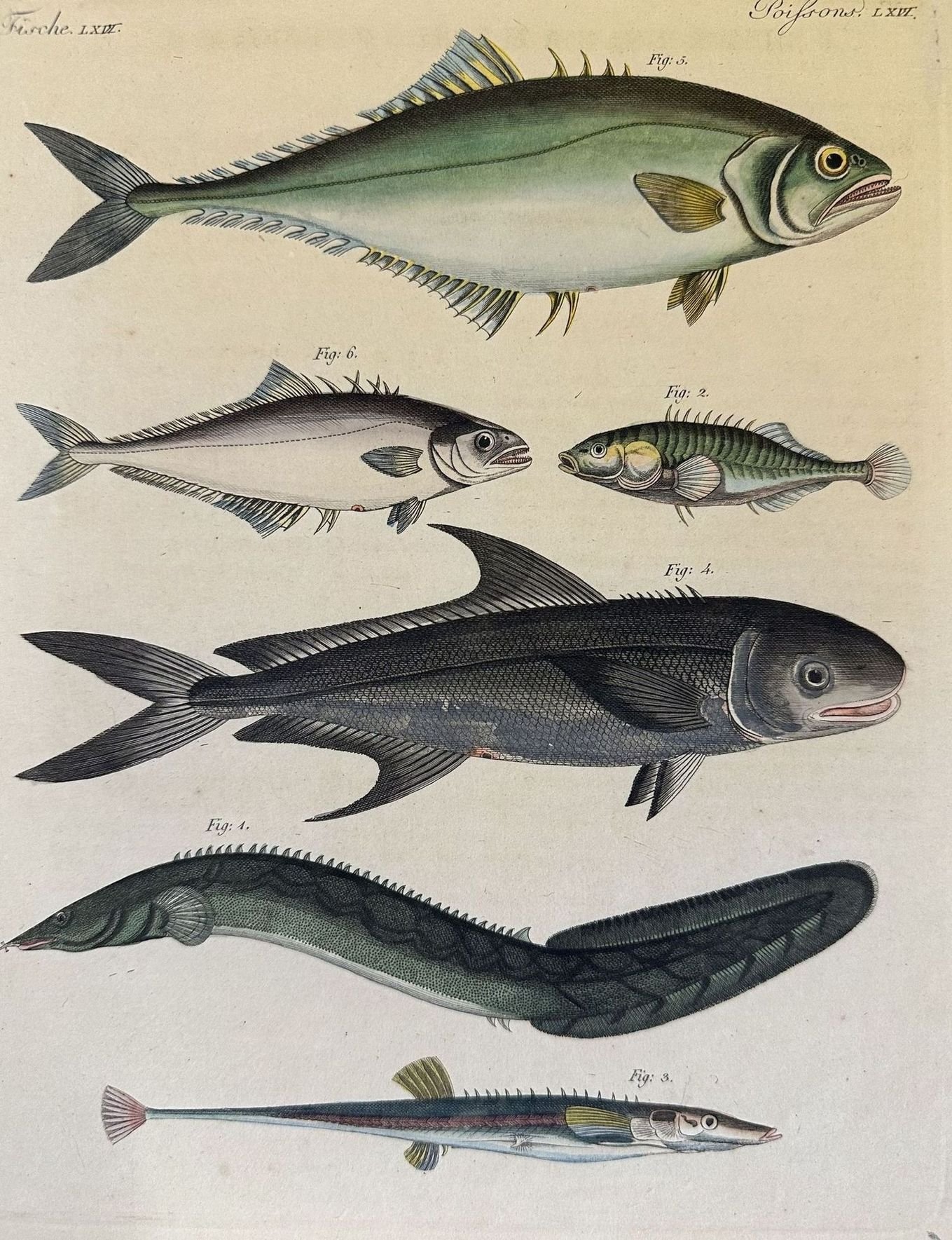 Acquaforte colorata a mano di un gruppo di sei pesci tra cui due specie di sgombro (Sgombier saliens; Scomber niger), pesce coltello, Gasterosteus spinachia. Data: fine settecento Tecnica: Acquaforte colorata a mano Dimensione del foglio: 270x210 mm Dimensione incisione: 205x158 mm Condizioni: Buone. Alcune fioriture.Etching of late 18th century representing six species of mackerels (Sgombier saliens; Scomber niger), knife fish, Gasterosteus spinachia. Date: late 18th century Technique: etching coloured by hand Size of the page: 270x210 mm Size of the engraving: 205x158 mm Conditions: Good conditions. Some foxing