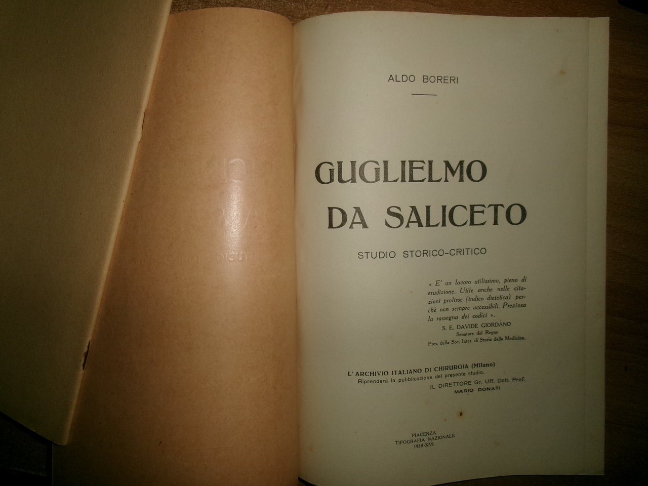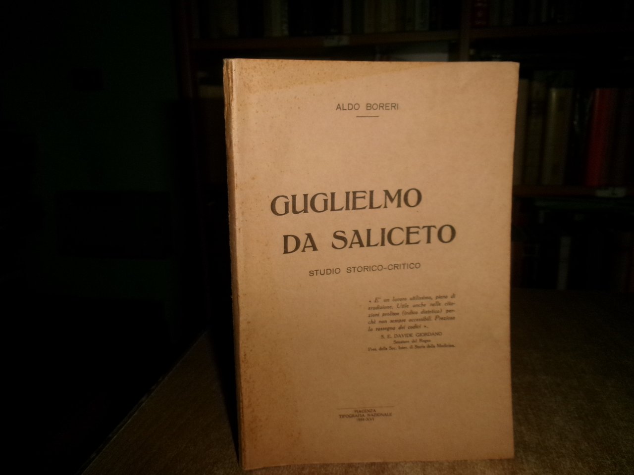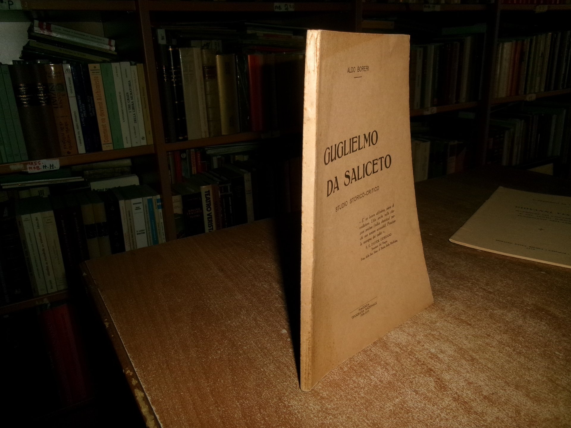 ALDO BORERI. Piacenza, Tipografia Nazionale 1938-XVI. GUGLIELMO DA SALICETO studio storico-critico. In-8°, br. orig. 112 pp. Ottimo esemplare. Uff. A - I - 1 - 2