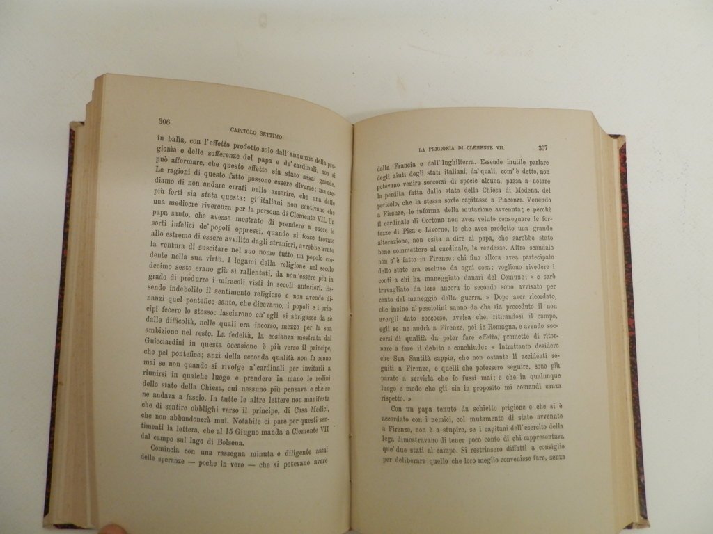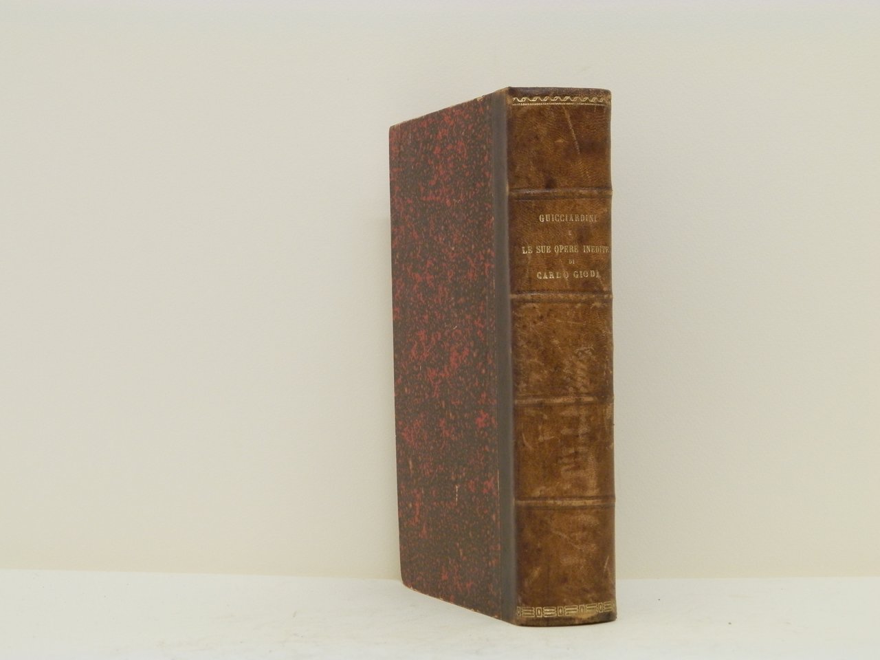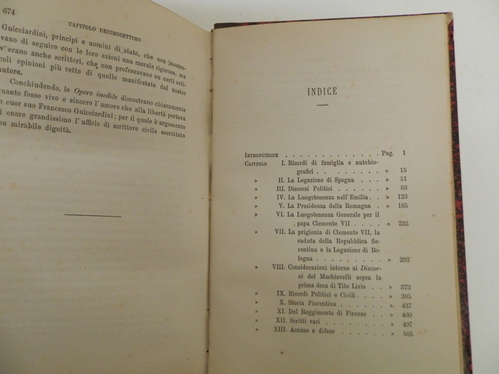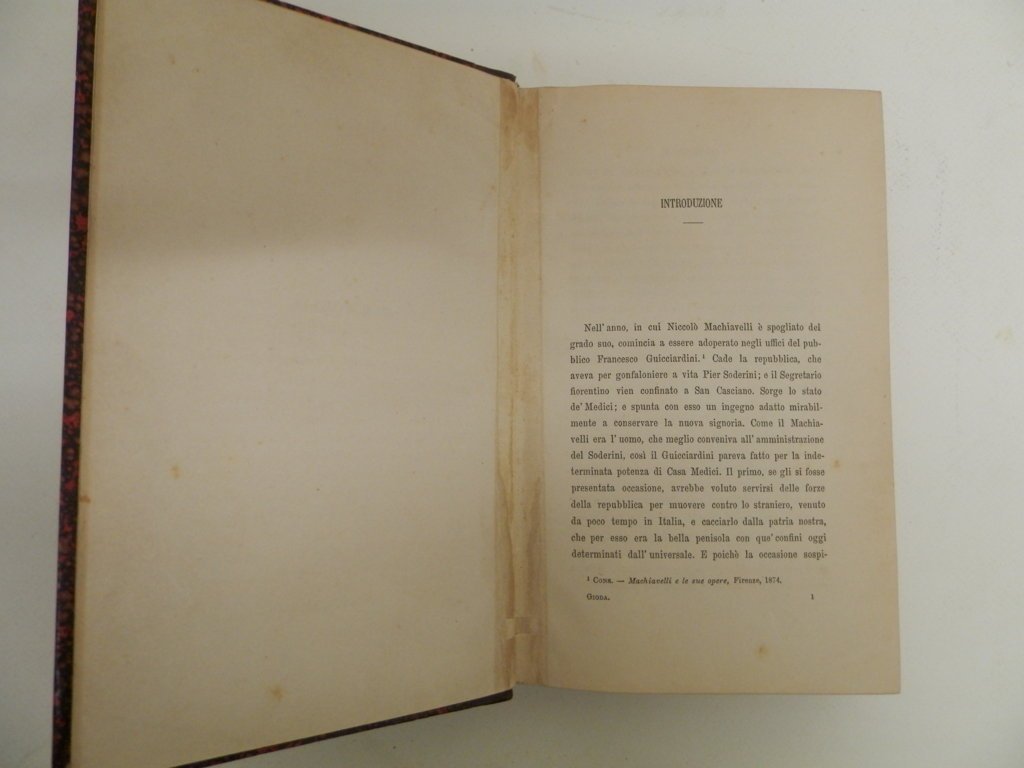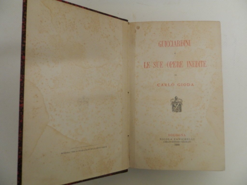 4°, mm 220x150, pp. (6) 676, leg. coeva in mz. pell dorso a quattro nervi con fregi e tit. in oro, occhietto, front. a due colori e dedica. Introduzione, testo e indice. All'ultima pagina: “Edizione di soli trecento esemplari”. Ottima conservazione. Carlo Gioda (1836 - 1903), storico di chiara fama, dedicò gran parte della sua attività scientifica ai pensatori politici del Cinquecento italiano. Indice dei capitoli: I Ricordi di famiglia e autobiografia - II La Legazione di Spagna – III Discorsi Politici - IV La Luogotenenza nell'Emilia - V La Presidenza della Romagna - VI La luogotenenza generale per il papa Clemente - VII La prigionia di Clemente VII e la cadura della Repubblica fiorentina e la Legazione di Bologna - VIII Considerazioni intorno ai Discorsi del Machiavelli sopra la prima deca di Tito Livio - IX Ricordi Politici e Civili - X Storia Fiorentina - XI Del Reggimento di Firenze - XII Scritti vari - XIII Accuse e difese XIV Guicciardini e i casi di Firenze - XV Guicciardini e la terza ristorazione Medicea - XVI Guicciardini a Napoli - XVII Guicciardini e il signor Cosimo.. *** TUTTI I NOSTRI LIBRI SONO VISIBILI PREVIO CONTATTO MAIL O TELEFONO NELLA NUOVA SEDE DI MILANO: LIBRERIA COSMOPOLIS, VIA JOMMELLI, 22. ***