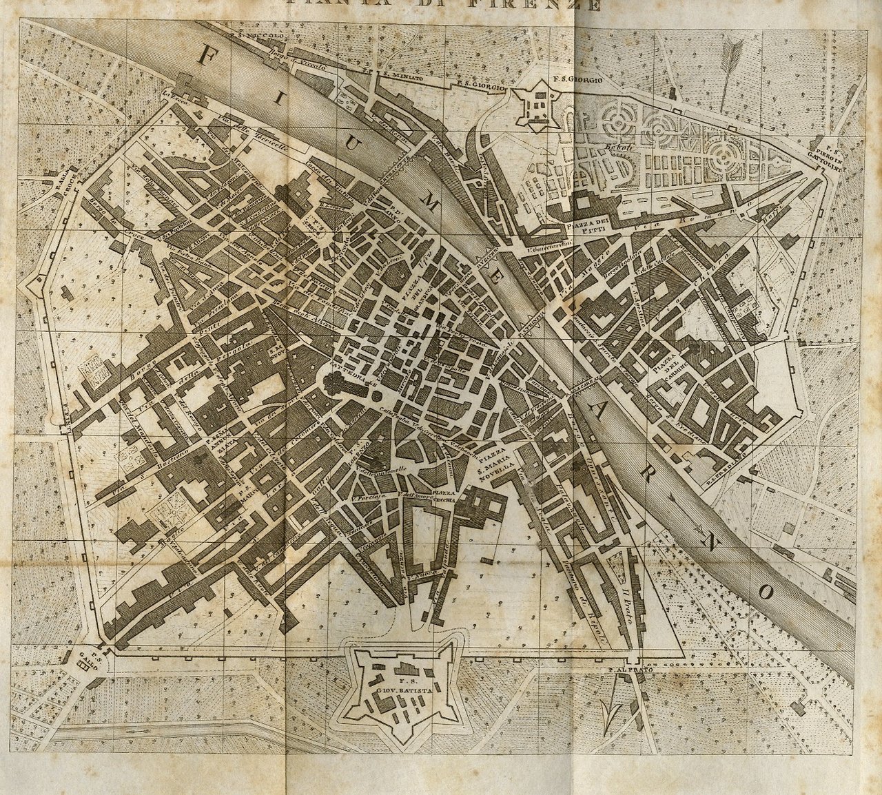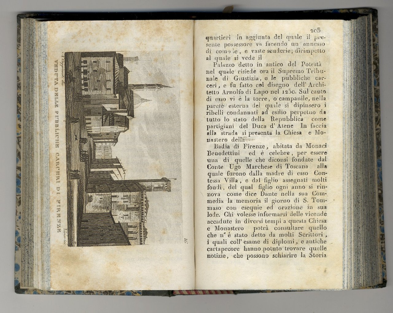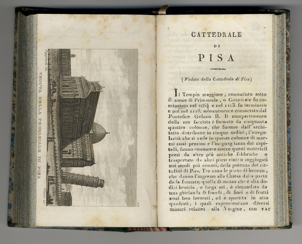 Firenze, presso Giuseppe Vanni, 1838, due parti legate in un volume, in-16, legatura coeva in mezza tela, con titolo in oro al dorso, tagli spruzzati, pp. [2], 570, [6], in paginazione continua. Con una pianta della città ripiegata, una carta della Toscana ripiegata e 59 (su 60?) tavole incise in rame f.t.