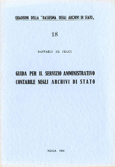 106 p. ; 24 x 17 cm. Quaderni della "Rassegna degli archivi di Stato". Brossura editoriale, copertina in cartoncino flessibile di colore celeste, con titolo impresso al piatto e al dorso. Codice libreria 4247.