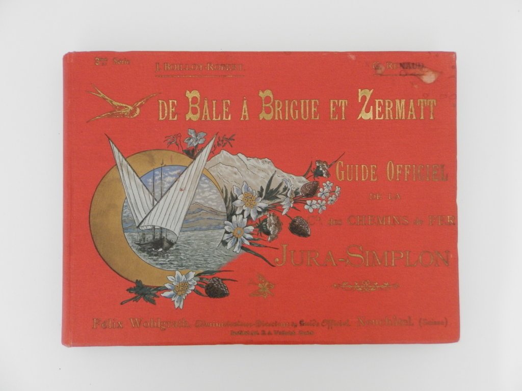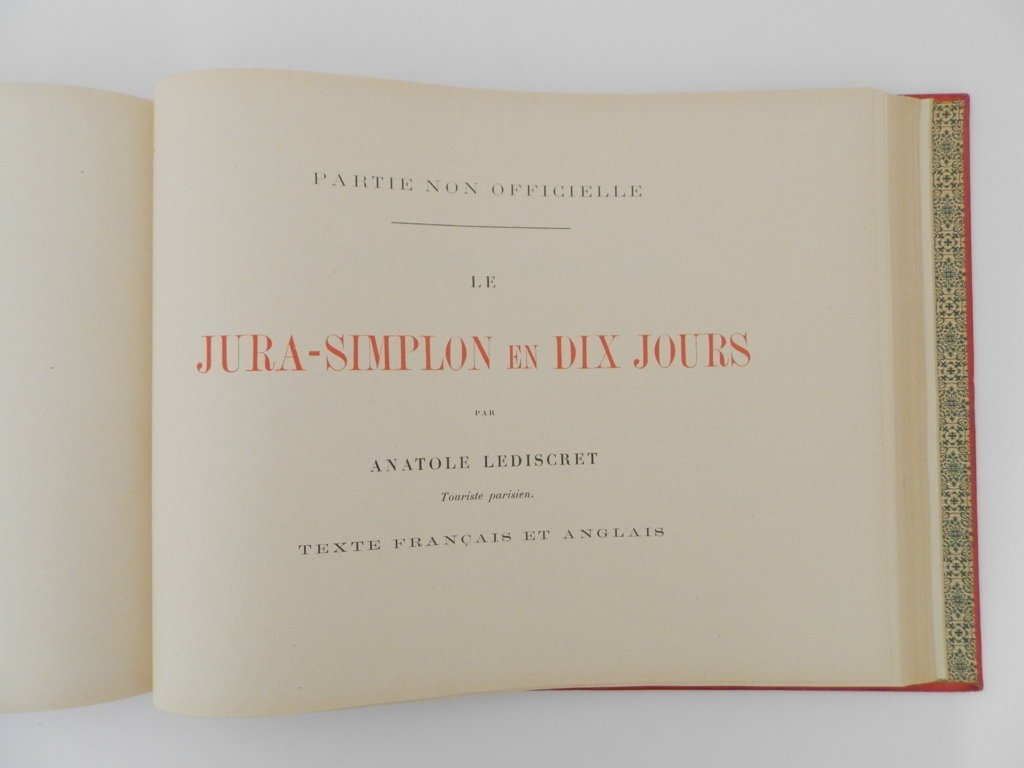 4^ oblungo, due parti di pp. 74; 106, nella prima parte 49 tavole fotografiche e 54 di pubblicità segue la seconda parte, infine tre carte di cui una ripiegata. Bella legatura in tela policroma illustrata. Magnifico esemplare. La seconda parte s'intitola: "Partie non officielle. Le Jura-Simplon en dix Jours par Anatole Lediscret. Touriste parisien". Senza data ma fine XIX secolo. Probabile edizione originale.. *** TUTTI I NOSTRI LIBRI SONO VISIBILI PREVIO CONTATTO MAIL O TELEFONO NELLA NUOVA SEDE DI MILANO: LIBRERIA COSMOPOLIS, VIA JOMMELLI, 22. ***