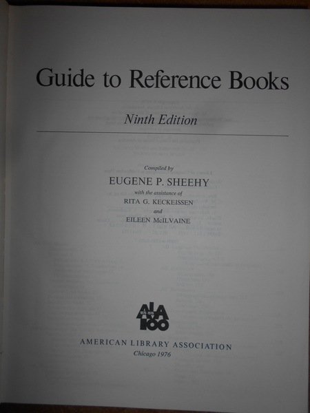 Eugene, P. Sheehy. Chicago, American Library Association, 1976. GUIDE to Reference Books. Ninth Edition. In-8° grande, tela edit. e oro. xviii, 1015 pp. con testo su due colonne. Come nuovo. Uff. B- II - 5
