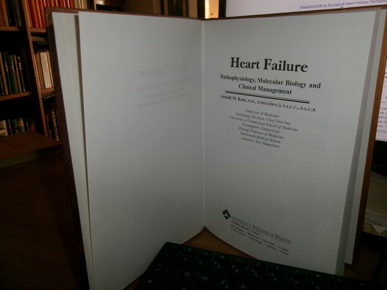 M.ARNOLD KATZ. Philadelphia... Lippincott Williams & Wilkins, 2000. HEART FAILURE. Pathophysiology, Molecular Biology, and Clinical Management. In-8°, cartonato edit. ill. a col. xvi, 381 pp. con illustrazioni in nero n.t. Ottimo esemplare con testo in inglese. Uff. stanzetta I - 2