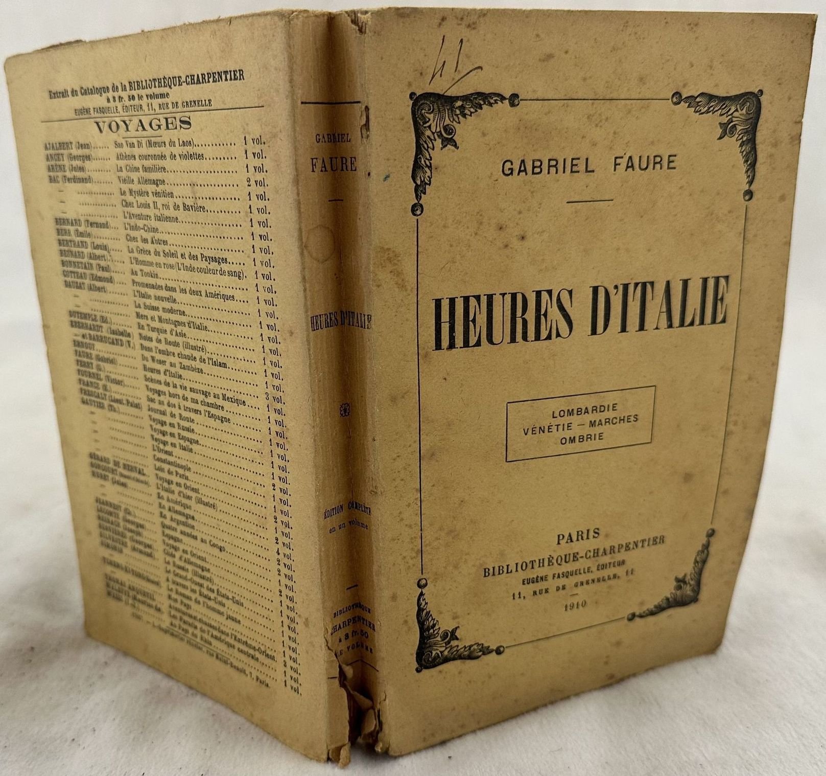 Prima edizione del 1910, quarto migliaio, di questa opera del poeta e scrittore francese Gabriel Faure (1877-1962) noto per i suoi libri di viaggio molti dei quali in Italia. All'interno: Verona, Vicenza, Lago d'Iseo, Brescia, Bergamo, Bellagio, Marche, Perugia, Arte Umbra, Assisi, Montefalco ec. In buone condizioni. Copertina editoriale in buone condizioni generali con lievi usure ai margini e dorso. Legatura in buone condizioni. Pagine in buone condizioni con rare fioriture. In 8. cm 19x12. Pp. (6)+245+(5).First edition of 1910, fourth thousand, of this work by the french poet and writer Gabriel Faure (1877-1962) famosu for his books of travels many of them in Italy. Inside: Verona, Vicenza, Lago d'Iseo, Brescia, Bergamo, Bellagio, Marche, Perugia, Arte Umbra, Assisi, Montefalco ec. In good conditions. Editorial cover in good general conditions lightly worn ihe extremities. Binding in good conditions. Pages in good conditions with occasional foxing.In 8. cm 19x12. Pp. (6)+245+(5).<BR><BR>