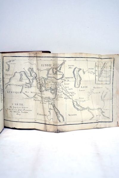 XI. 196 pages. 2 cartes dépliantes. (13,5x9cm). Pleine basane du temps. Dos lisse orné et titré en or. Roulette dorée sur les coupes. Epidermures sur la reliure. Manque de cuir important à la coiffe inférieure. Dos frotté et légèrement fendillé. Coiffe supérieure élimée. Manques de cuir sur le plat supérieur. Coupes frottées. Quelques rousseurs et défauts d'usage à l'intérieur. Petit volume relié dans une pleine basane qui mérite une importante restauration. L'intérieur est pourvu de deux cartes géographiques dépliantes.