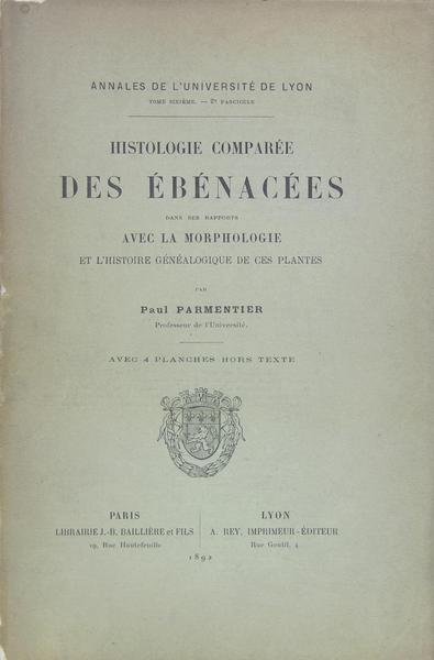 Librairie Baillière & Rey, 1892. In/4 broché, couverture imprimée, 4 planches in-fine, 155 pages. Exemplaire non coupé. La famille des Ébénacées est une famille de plantes dicotylédones qui comprend 500 espèces réparties en deux à six genres. Ce sont des arbres ou des arbustes principalement des régions tropicales mais qui comptent quelques espèces dans les zones tempérées. Ils constituent une importante source de bois : le bois d'ébène et de fruits. Le plaqueminier du Japon est cultivé sous les climats tempérés pour ses fruits (kakis). Une autre espèce produisant des fruits comestibles est le plaqueminier de Virginie alors que les fruits du plaqueminier d'Europe sont uniquement ornementaux. La classification phylogénétique place cette famille dans l'ordre des Ericales et y incorpore les Lissocarpaceae.