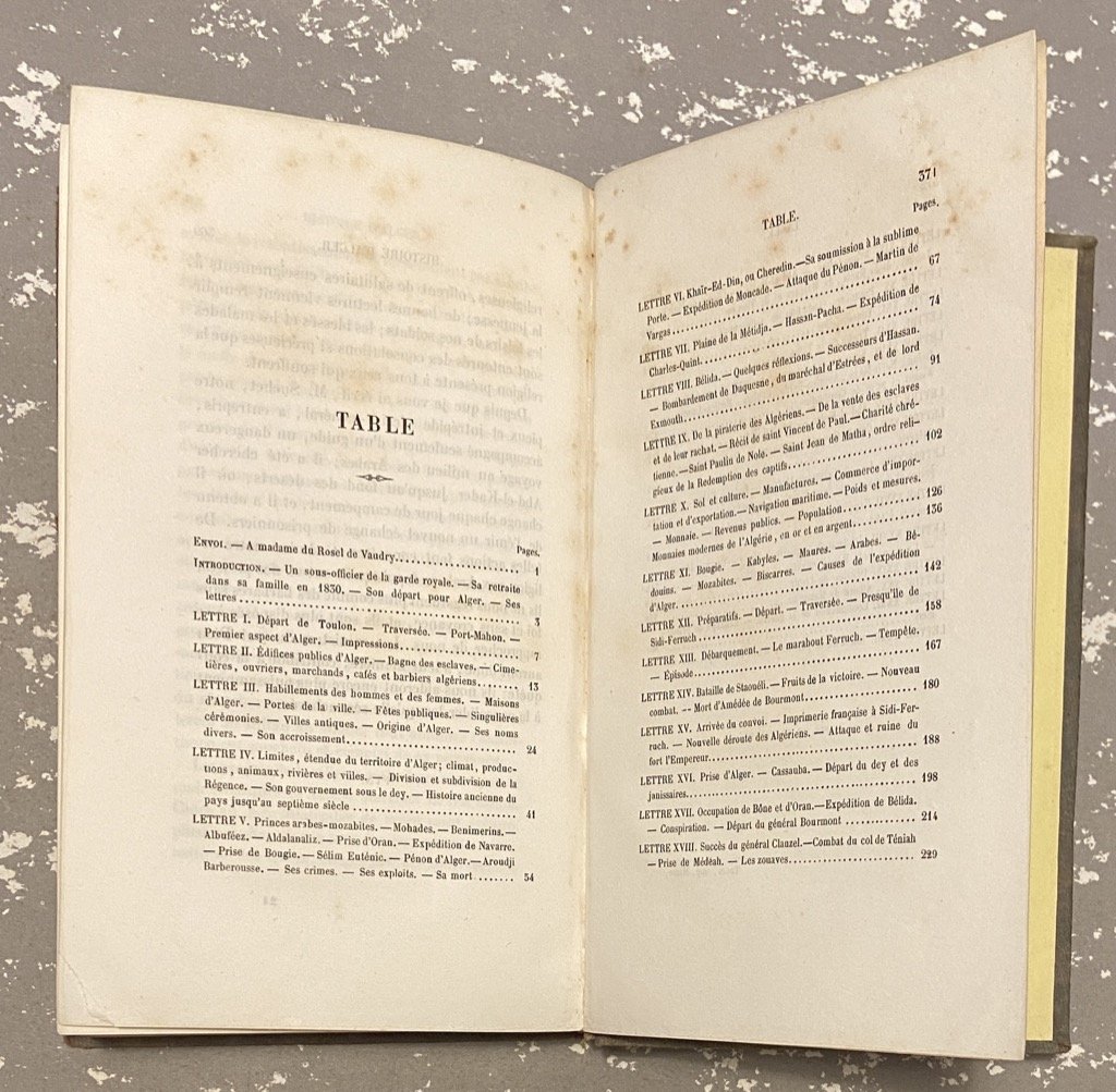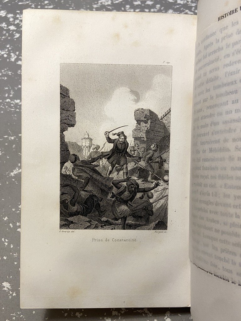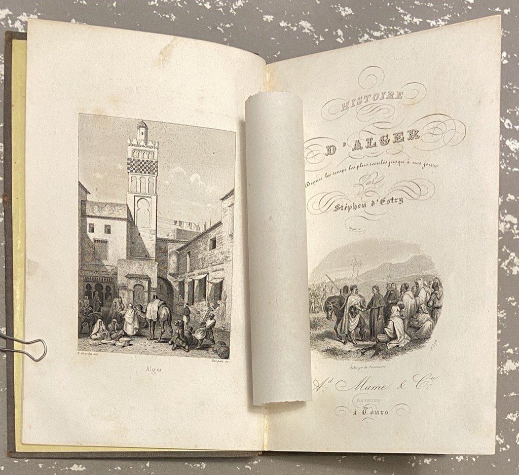 Legatura strenna in percallina con elaborati fregi dorati e in vari colori, tagli dorati, sguardie gialle con dedica sul primo contropiatto, in ottavo cm 22 x 13.5, pp (8) 3 372, doppio frontespizio tipografico e calcografico, antiporta e due tavole incise da Nargeot da invenzione di K. Girardet. In francese. Segni d’usura sui bordi dei piatti, con lievi aloni; dedica manoscritta sulla prima sguardia, interno ben conservato con qualche lieve fioritura. Quarta edizione di questa descrizione e storia dell’Algeria pubblicata parallelamente alla conquista coloniale francese, con la prima edizione apparsa nel 1841. Il volume, rivolto alla gioventù francese, è scritto in forma di lettere d’un ufficiale dell'Armée d'Afrique che narra le operazioni dal 1830 alla sconfitta di Abd e- Kader e insieme descrive località e genti; l’antiporta rappresenta uno scorcio di Algeri mentre le due tavole sono dedicate allo sbarco a Sidi Ferruch e alla presa di Costantina. Gay, 1062ter, Taillart, 1292; Playfair, 1571.