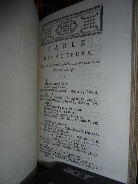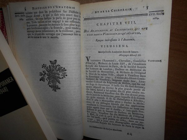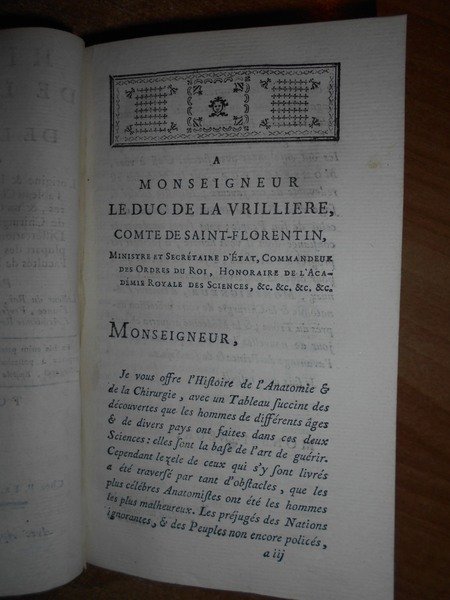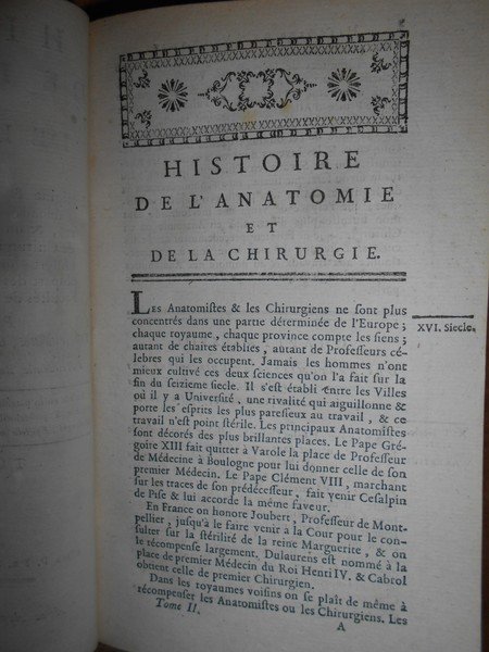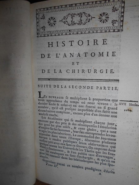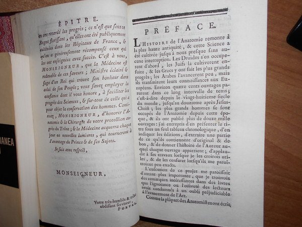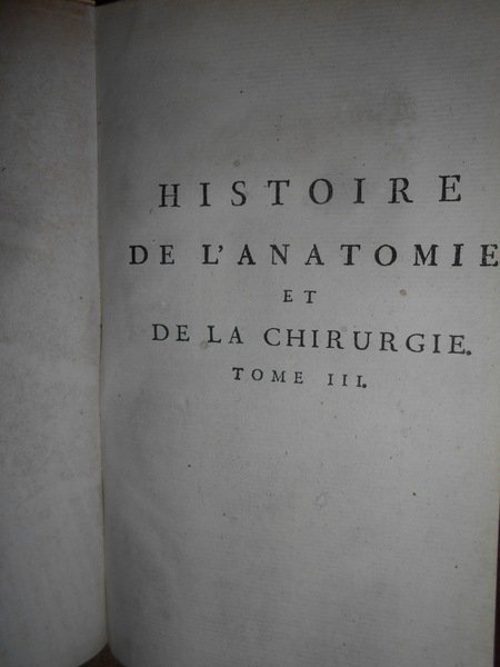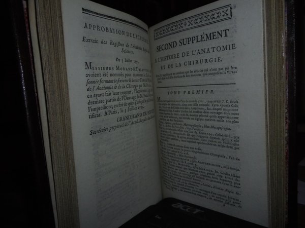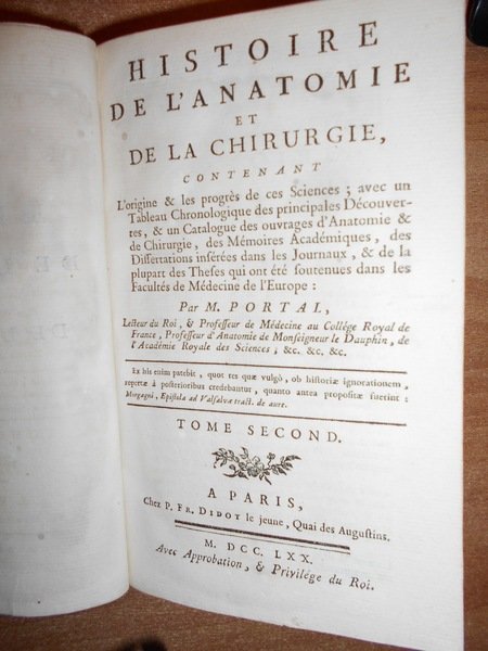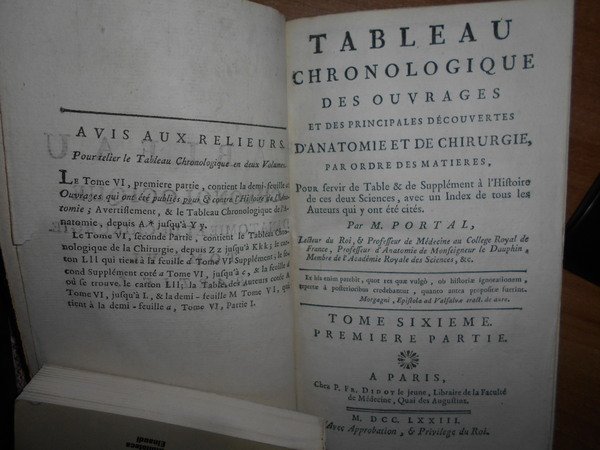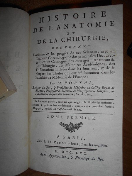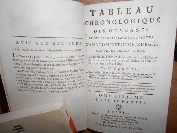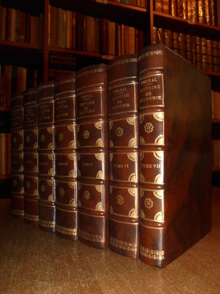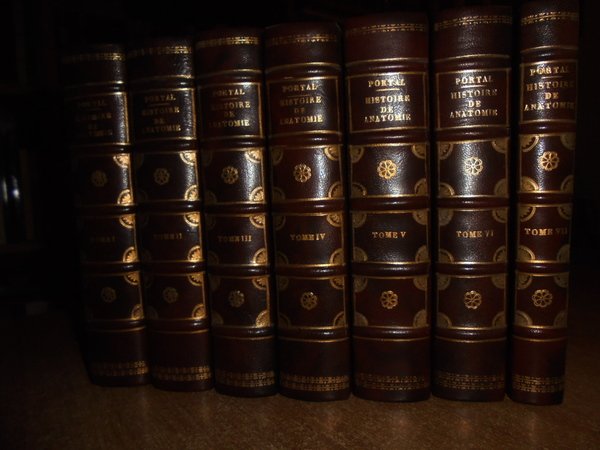 M. Portal. Paris, Chez P. Fr. Didot le jeune, 1770 - 1773. Histoire de l' Anatomie et de la Chirurgie contenant L' origine & les progrès de ces Sciences; avec un Tableau Chronologique des principales Découvertes, & un Catalogue des ouvrages d' Anatomie. 7 tomi in-16° (17,5 x 11 cm.), piena pelle, dorsi a 5 nervi con fregi e titoli in oro. Tome premier: xlviij, 658 pp.; Tome II. 680 pp.; Tome III. 642 pp.; Tome IV. 729 pp.; Tome V. 706, (2) pp.; Tome VI. partie I. viij, Tome VI. partie II. complessive 899, (1) pp. + 57 pp. + 177 pp. Bellissimo esemplare in prima edizione (completo). Uff. F - 3
