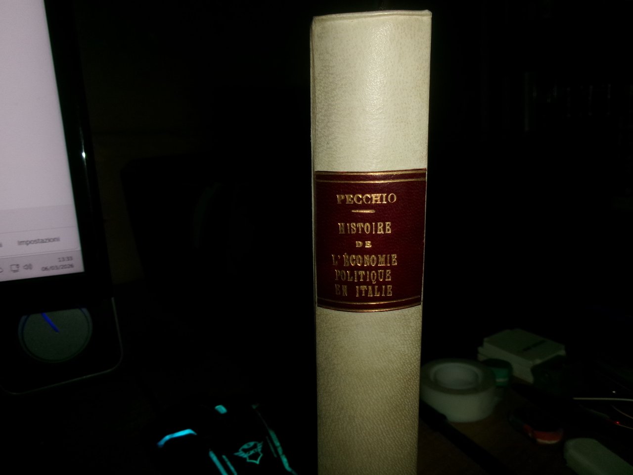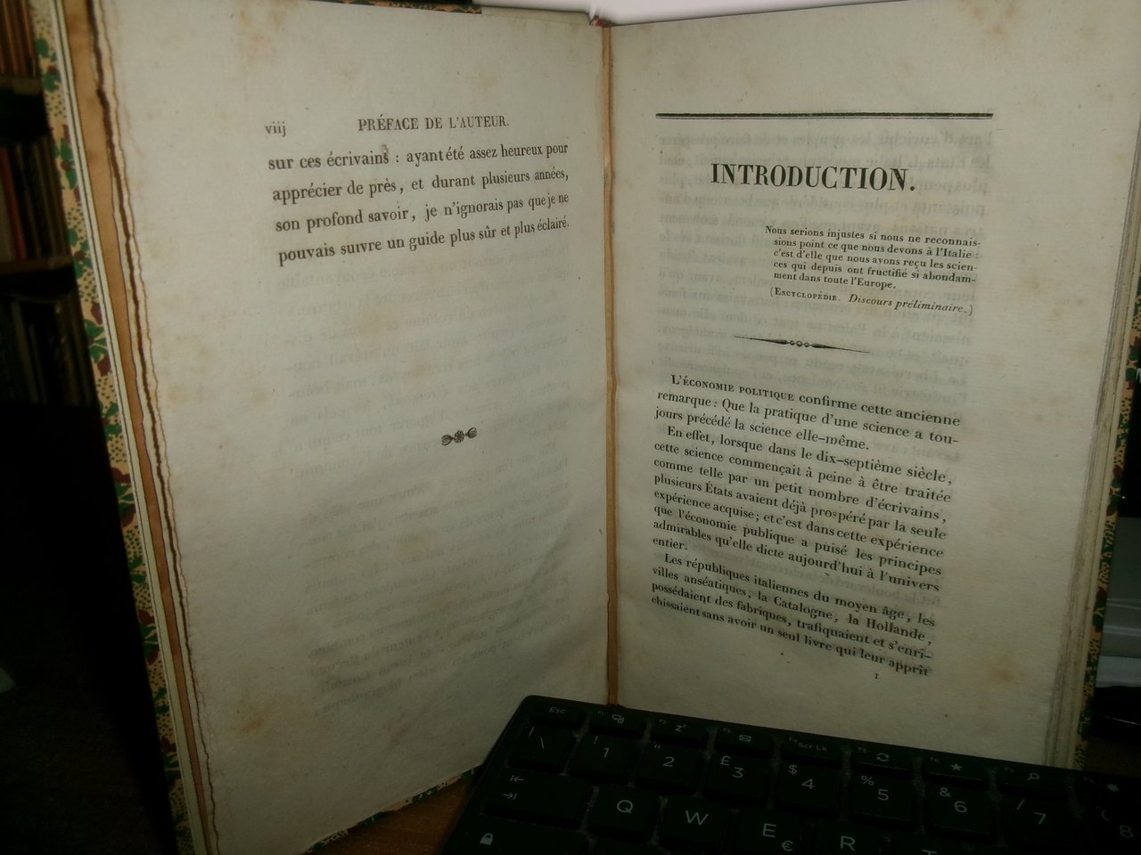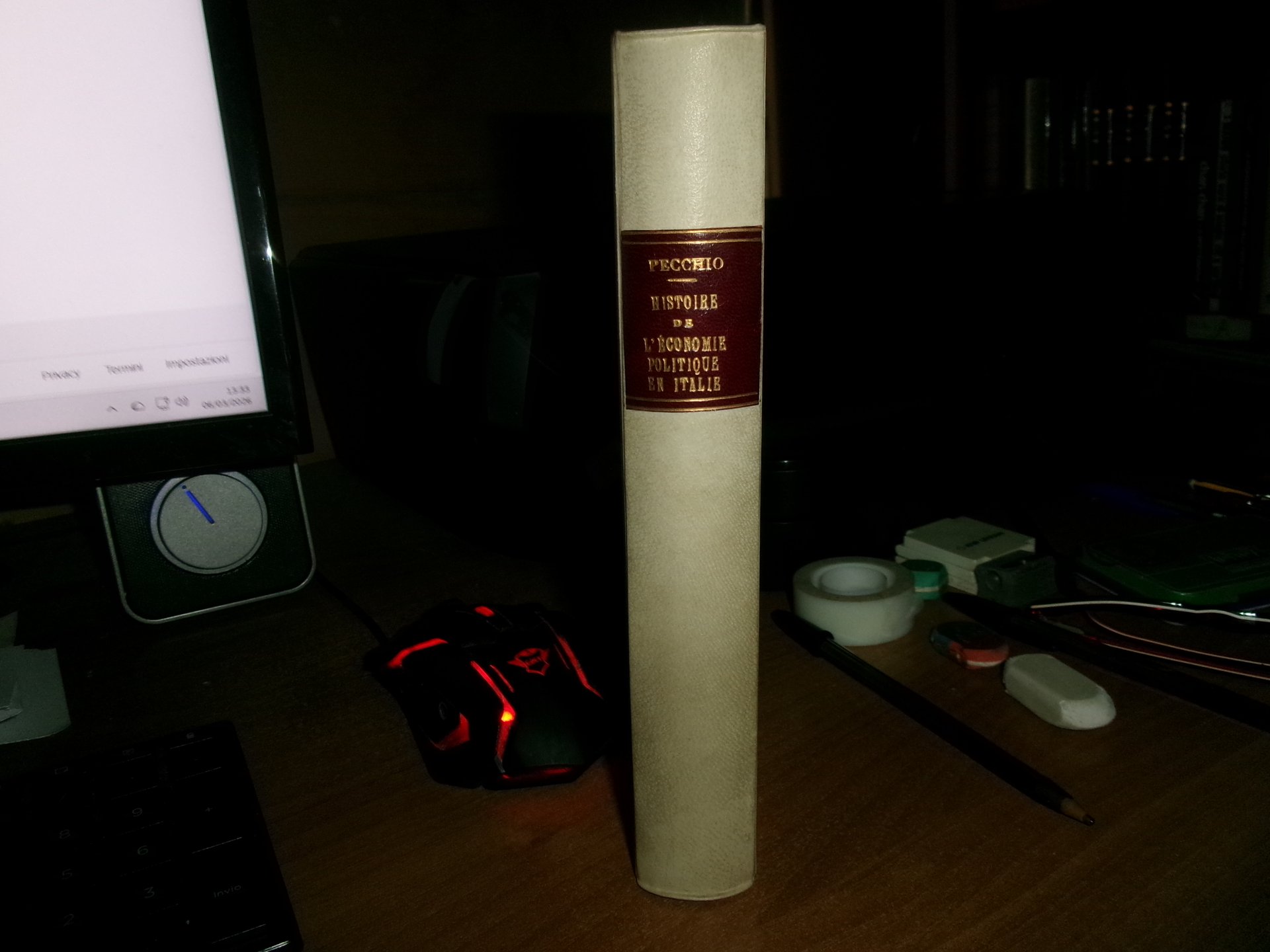Comte Joseph, Pecchio. Paris, A. Levavasseur Libraire, 1830. Histoire de l' économie Politique en Italie, abrégé critique des économistes italiens. Edizione originale. In-8°, m. pergamena con titolo in oro entro tassello al dorso, copertine originali conservate. 424 pp. Ottimo esemplare in una bella legatura con le brossure originali conservate e testo in francese. Ex libris al verso della cop. anteriore. Neg. mens. bianca cassa.