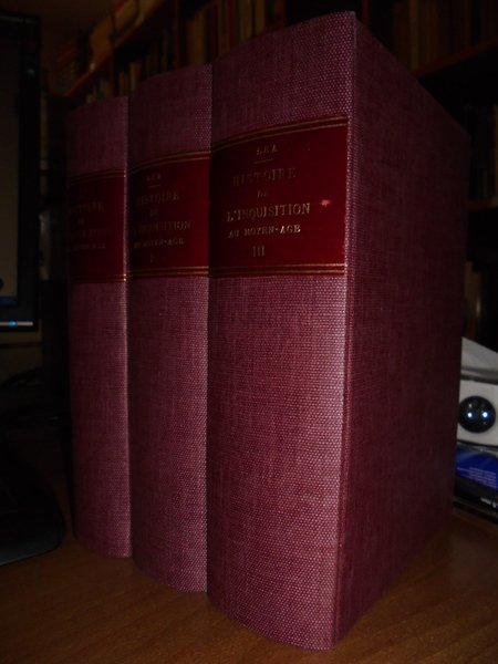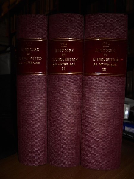 Henry-Charles Lea. Paris, Société Nouvelle de Librairie et d' édition, 1900 - 1901 - 1902. Histoire De L' Inquisition au Moyen-Age. Ouvrage traduit sur l' exemplaire revu et corrigé de l' Auteur par Salomon Reinach. Précédé d' une introduction historique de Paul Fredericq. 3 volumi in-16°, tela bordeaux con titoli in oro entro tasselli ai dorsi. xl, 631 pp.; xix, 682 pp.; v, 898 pp. Bell' esemplare raro a trovarsi completo. Uff. TV. mob. nostro. Spese di spedizione per l' Italia euro 9