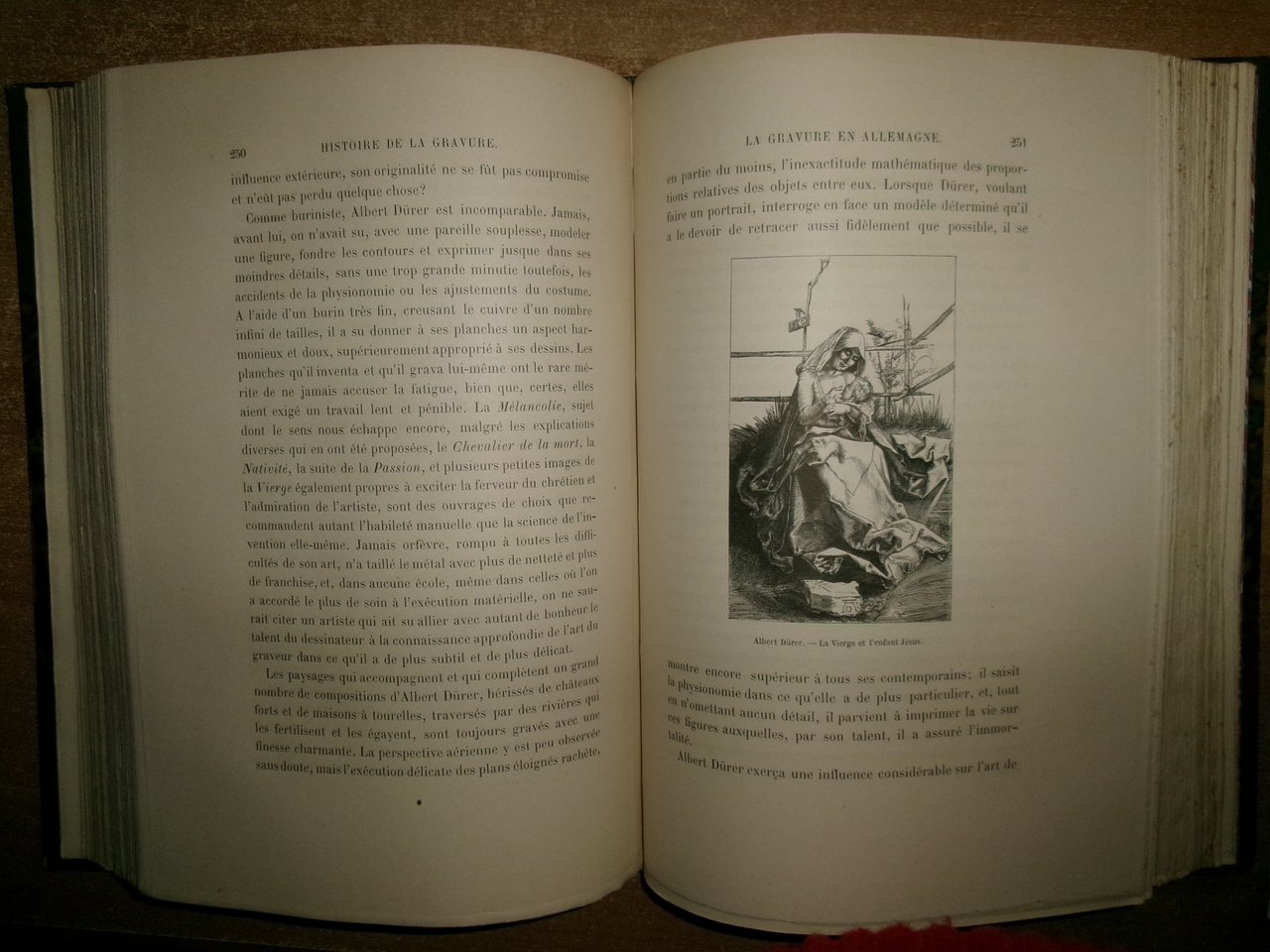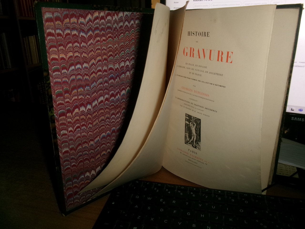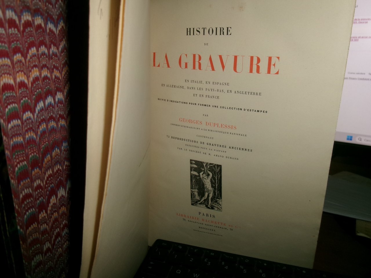 DUPLESSIS, George. Paris, Libr. Hachette, 1880. Histoire de la gravure en Italie, en Espagne, en Allemagne, dans les Pays-Bas, en Angleterre et en France, suivie d' indications pour former une collection d' estampes... contenant 73 reproductions de gravures anciennes exécutées pour la plupart par le procédé de M. Amand Durand. In-8° grande, m. pelle con angoli, dorso a nervi, taglio sup. dorato. (4), 528 pp. con illustrazioni n.t. e 73 tavole f.t. Bell' esemplare. Colin, La gravure et les graveurs, 224. Neg. arte mob. 11