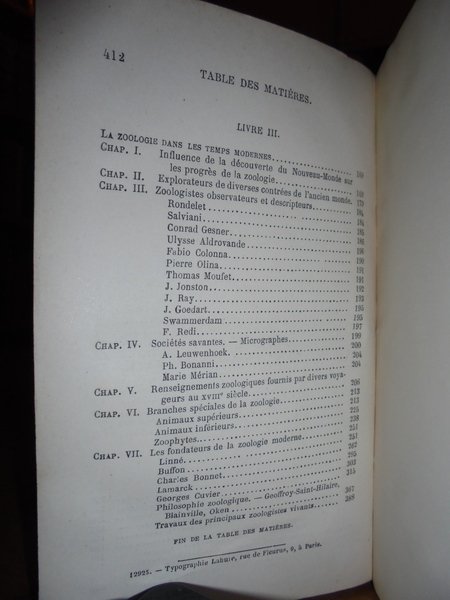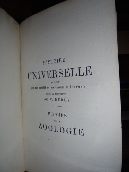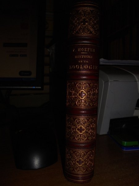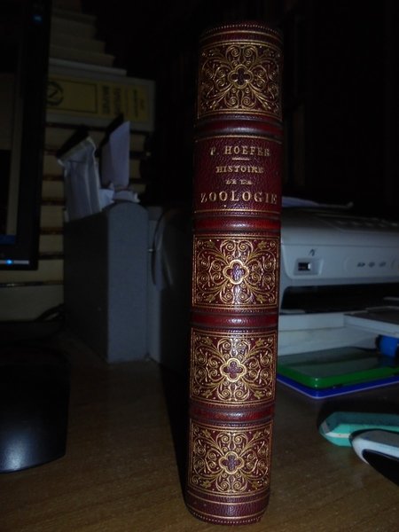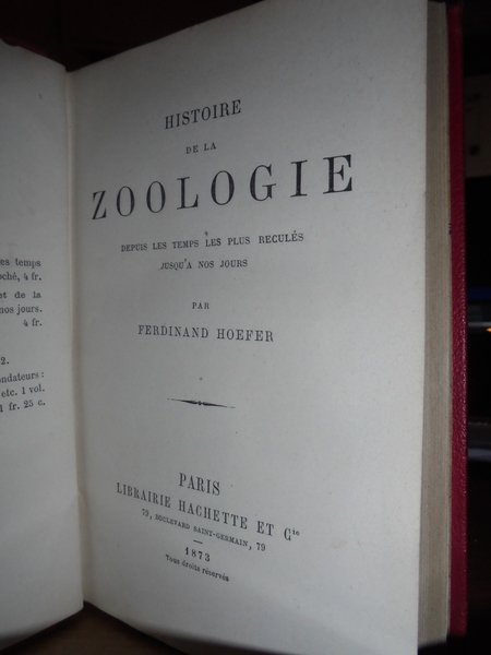 Ferdinand, Hoefer. Paris, Librairie Hachette et Cie, 1873. Histoire de la Zoologie depuis les temps les plus reculés jusqu'a nos jours. In-16°, pelle coeva con fregi floreali e titolo in oro al dorso, impressioni a secco sui piani. 412 pp. Bellissimo esemplare. Neg. antichi mob. 7.