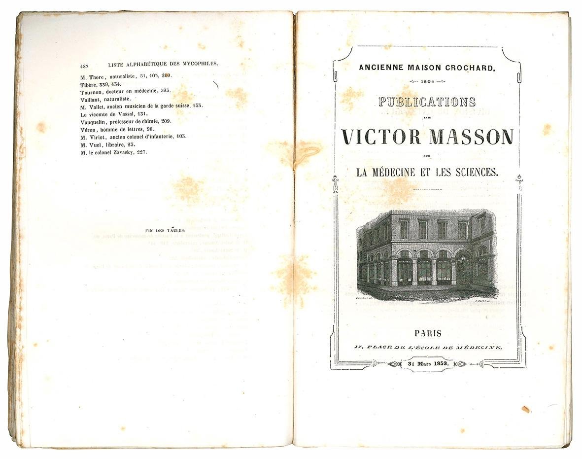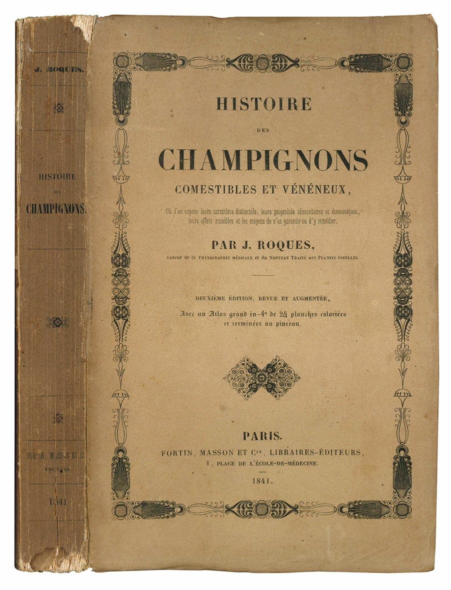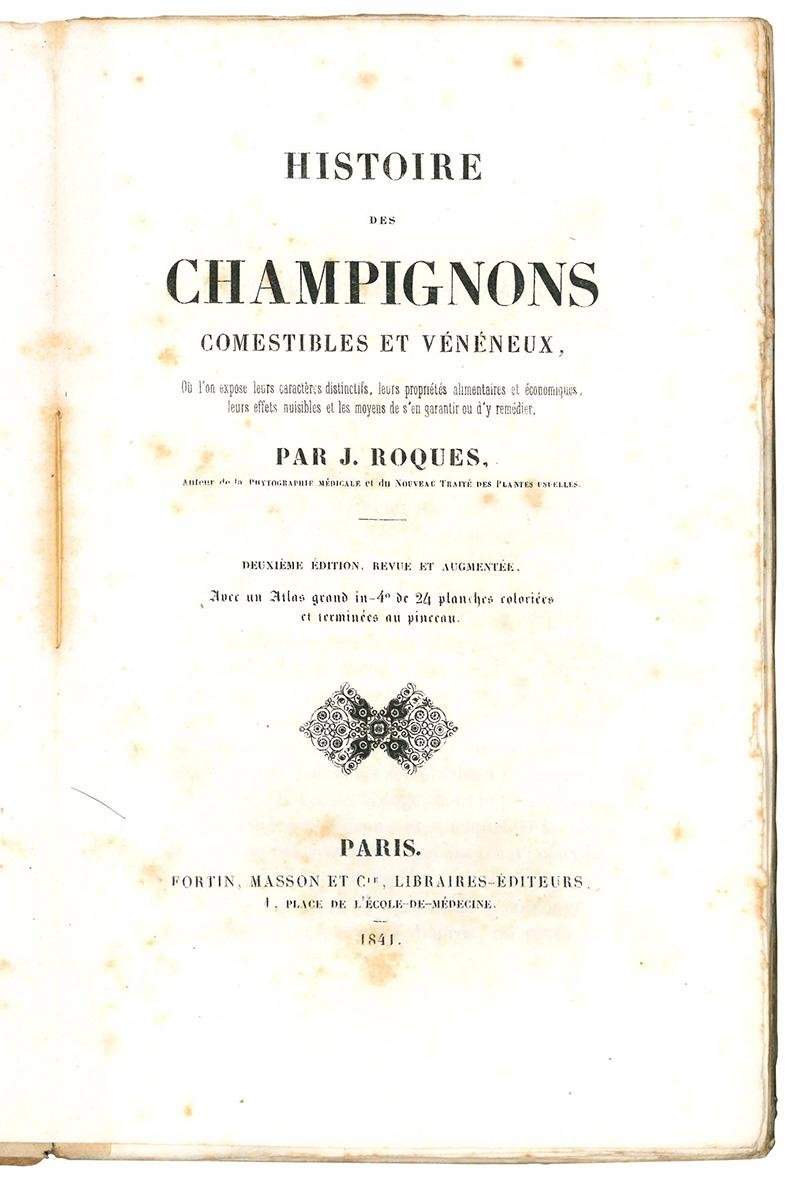 Histoire des champignons comestibles et vénéneux. Ou l'on expose leurs caractères distinctifs, leurs proprietés alimentaires et économiques, leurs effets nuisibles et les moyens de s'en garantir ou d'y remédier par J. Roques Deuxième édition, revue et augmentée, avec un Atlas grand in-4^ de 24 planches coloriées et terminées au pinceau. (insieme a:) Publications de Victor Masson sur la médecine et les sciences. Paris: 17, Place de l'Ecole de Médecine, 31 Mars 1853.
