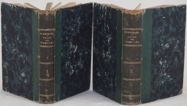 In 16. Dim. 18,5x12 cm. Pp. (4)+V+(1)+396+10 pl., (4)+524+(10). Prima edizione del 1845 di questo trattato sulla storia degli insetti scritto dal celebre entomologo e zoologo francese Emile Blanchard (1819-1900). Blanchard lavorò nel Museo Nazionale di storia naturale per un lungo periodo e nel 1862 diventà Presidente della sezione di storia naturale dei crostacei, invertebrati e insetti. L'opera è composta da due volumi ed è completa.Il primo tomo è dedicato agli Imenotteri e Coleotteri, il secondo ad altri tipi di insetti. Alla fine di ogni volume 10 planches molto dettagliate per un totale di 20 planches. Note manoscritte con matita colorata. In buone condizioni Copertina in mezza pelle coeva con titolo in oro al dorso in buone condizioni con lievi usure ai margini e dorso. Legatura in buone condizioni. Pagine in buone condizioni con fioriture e rare bruniture. Leggerissime gore d'umidità all'angolo inferiore destro. Planches dalla 18 alla 20 sono state invertite.Original edition of 1845 of this treaty work about history of insects by the famous french entomologist and zoologist Emile Blanchard (1819-1900). He worked in the National Museum of Natural history for a long time and in 1862 he became President of Natural History crustaceans, invertebrates and insects. This work is made up of two volumes and it is complete. The first tome is dedicated to Hymenopters and Coleopterons, the second one to the other kind of insects. At the end of each tome there are ten out of text very detailed planches for a total of 20 planches. Handwritten notes with coloured pencil. In good conditions. Half leather coeval cover with golden title and decorations in the spine in good general conditions slightly worn. Binding in good conditions. Pages are in good conditions with foxings and occasional yellowings. Very slight water stain in the lower right corner. Planches from 18 to 20 have been bound inverted.