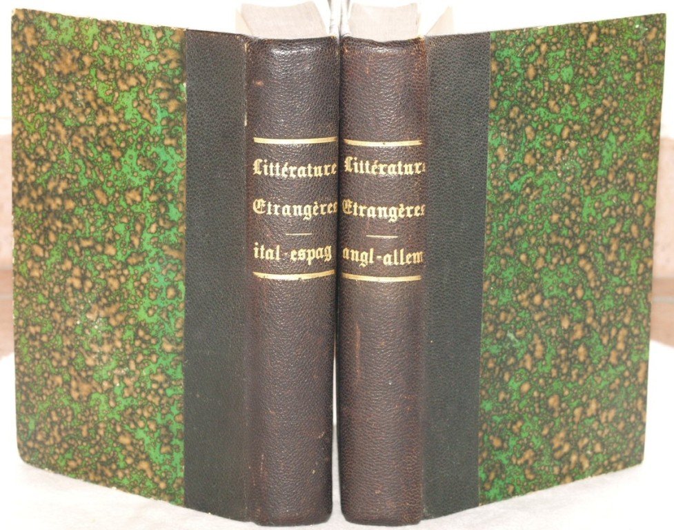 In 16. Dim. 18,5x12 cm. Pp. VII+411, VII+379. Opera completa in due volumi del 1880. Si tratta di uno studio di Demogeot sulla storia delle letterature straniere dell'Italia, Spagna, Inghilterra e Germania, in relazione alla letteratura francese. L'autore analizza le maggiori opere ed autori che hano caratterizzato la letteratura dei vari paesi analizzati e i diversi periodi. Tra gli argomenti trattati nella parte dedicata all'Italia: la letteratura dal medioevo, Rinascimento, Dante, Petrarca, Boccaccio, Sacchetti, Villani, i Medici, poesia epica, Ariosto, Machiavelli, Savonarola, influenza dell'Italia sulla Francia ecc. Copertina in mezza pelle con titolo in oro al dorso in ottime condizioni generali con lievi usure ai margini e dorso. Legatura in ottime condizioni. All'interno le pagine si presentano in ottime condizioni con fioriture. Lieve gora d'umidità all'angolo inferiore destro del volume primo da pag. 1 a 54. Angolo superiore destro mancante nel frontespizio del volume secondo.Complete work in two volumes of 1880. It is a study by Demogeot about the history of strangers litterature of Italy, Spain, England and Germany in relation to french litterature. the author analyzes the main works and authors that characterized the litterature of different periods and countries. Among the issues treated in the part dedicated to Italy: the medieval litterature, Renaissance, Dante, Petrarca, Boccaccio, Sacchetti, Villani, i Medici, poesia epica, Ariosto, Machiavelli, Savonarola, influence of Italy on France ec. Half leather cover with golden title in the spine in very good general conditions slightly worn in the edges and spine. Binding in very good conditions. Inside pages are in very good conditions with foxings. Slight humidity stain in the lower right corner of first volume from page 1 to 54. Upper right corner missing in the title page of volume two.