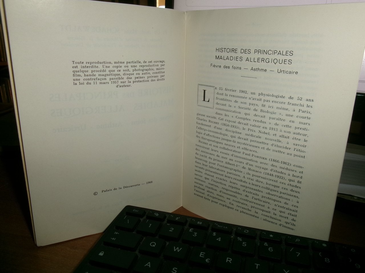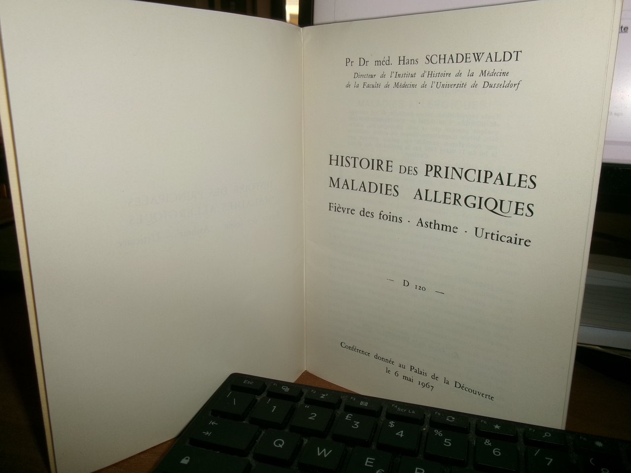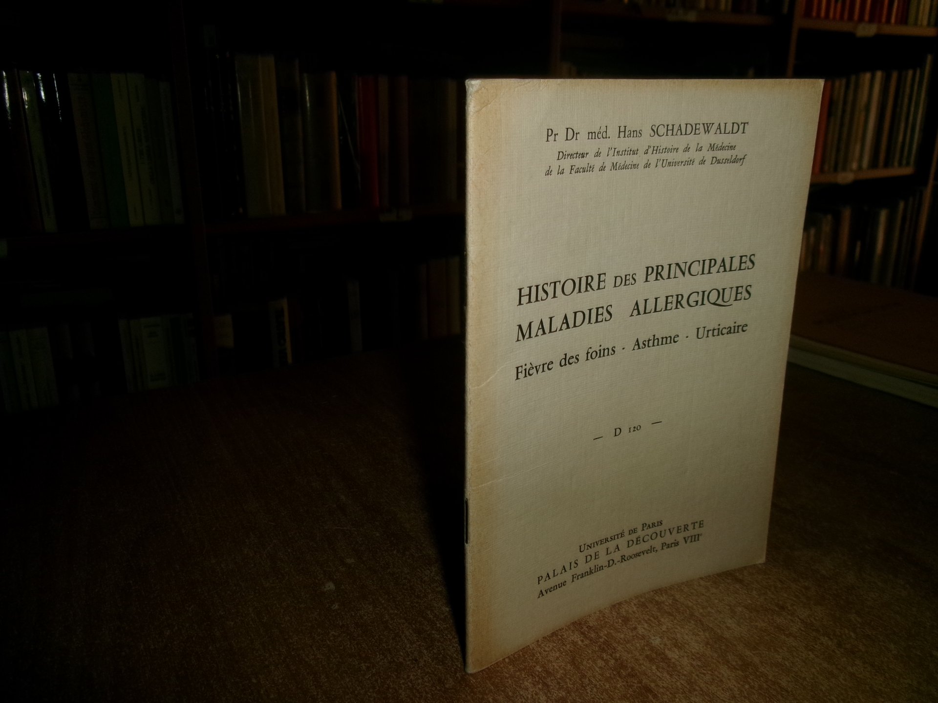 HANS SCHADEWALDT. Université de Paris, Palais de la Découverte, 1967. HISTOIRE des PRINCIPALES MALADIES ALLERGIQUES. Fièvre des foins - Asthme - Urticaire. In-16°, cart. edit. 38 pp. Opuscolo in ottimo stato con testo in francese. Neg. med. mob. G