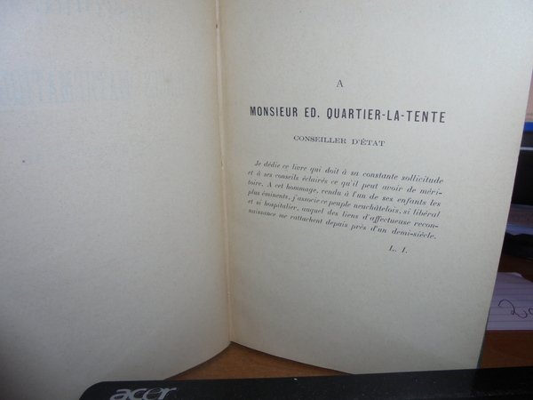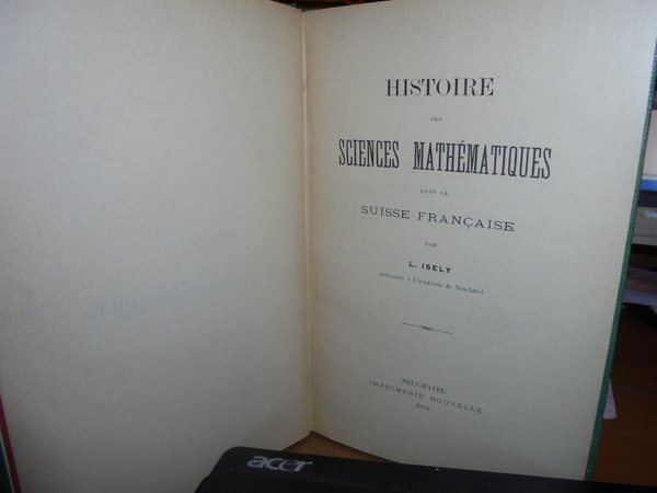 L. ISELY. Neuchatel, Imprimerie Nouvelle, 1901. HISTOIRE des SCIENCES Mathématiques dans la SUISSE Française. In-8° piccolo, tela verde con titolo in oro al dorso, copertine originali conservate. vii, 215 pp. Ottimo esemplare in legatura recente con le copertine originali conservate e dedica non firmata dell' Autore. Neg. mob. nero 20