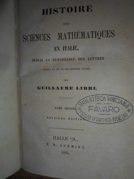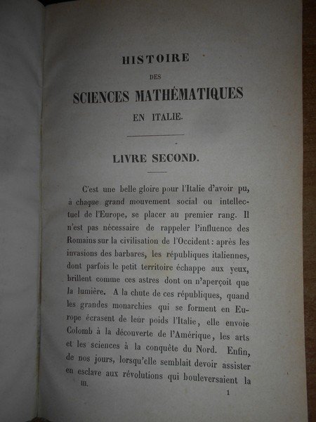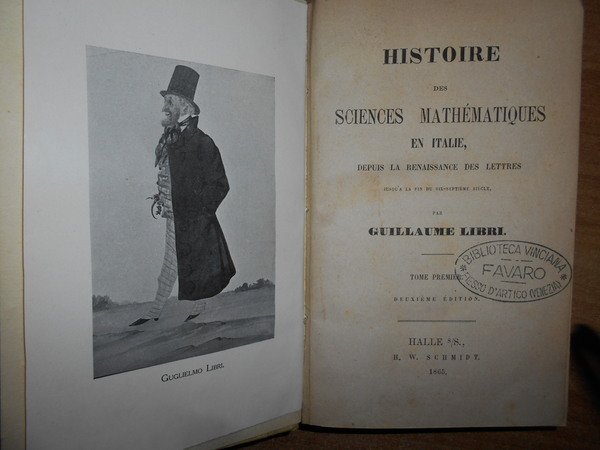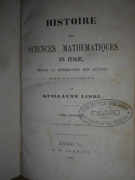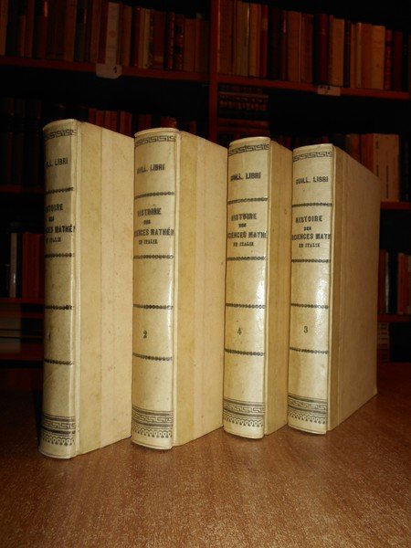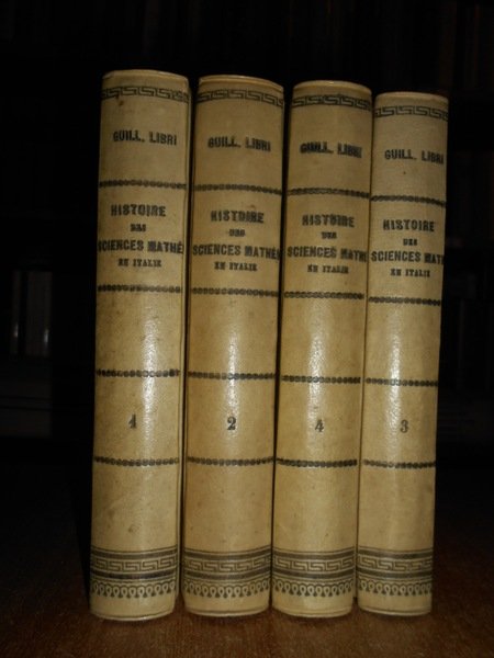 Guillaume, Libri. Halle, H. W. Schmidt, 1865. Histoire des Sciences Mathématiques en Italie. 4 volumi in-16° grande, m. pergamena coeva con titoli impressi ai dorsi. Ex libris al verso dei piani anteriori. xxii, 456, pp.1 f. bianco. con una tavola raffigurante Guglielmo Libri in antiporta. ; (viii), 530 pp. 1 f. bianco.; viii, 444 pp. 1 f. bianco; viii, 492 pp. 1 f. bianco. Nei 4 volumi vi sono alcune illustrazioni n.t. Bell' esemplare in legatura coeva con lievi segni a matita in poche pagine. Uff. F - 5