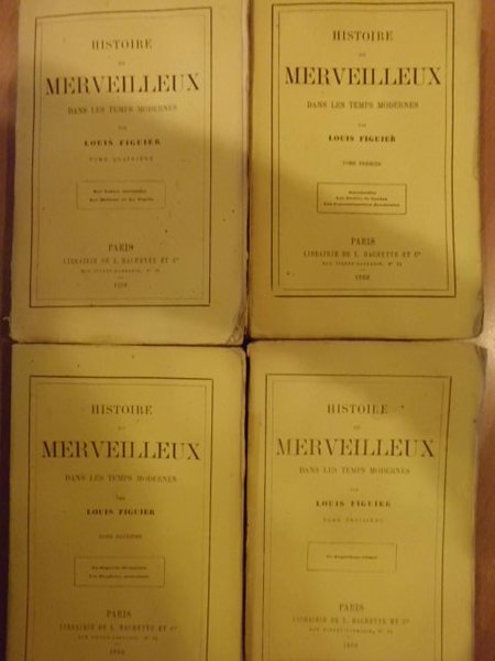 FIGUIER, Louis (1819 - 1894). Paris, L. Hachette Et Cie., 1860. Introduction. - Les diables de Loudun. - Les convulsionnaires jansenistes. - La baguette divinatoire. - Les prophètes protestants. - Le magnetisme animal. - Les tables tournantes. - Les médium et les esprits. 4 volumi in - 16°, br. Complessive 1676 pp. Esemplare ben conservato; carta qua e là naturalmente rifiorita. Piccolo restauro nel dorso del primo volume. Edizione originale. "Ouvrage estimé, très important à consulter pour l' histoire de l' ocultisme, principalement dans les manifestations de l' Invisible, et les diverses pratiques de la Magie. On y trouve l' histoire de Cagliostro qui occupe 100 pp. de texte; il y est aussi parlé de Mesmer, Cazotte, Lavater, Dupotet, de Gasparin, Cahagnet, Eliphas Levi, Guldenstubbe, Allan Kardec, Home, etc." (Caillet, II, 3920). St. De Guaita, 324. Dorbon, 1632. Ouvaroff, 1669.