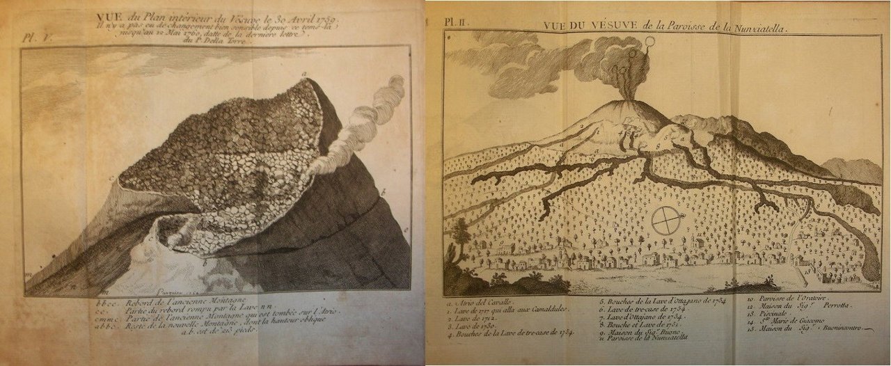 in-16, pp. XXIV, 399, leg. p. pelle coeva con fregi e tit. oro al d., tagli rossi. Risguardi in carta marmoriz. Con 6 tavv. inc. in rame più volte ripiegate raff. le fasi di eruzione del vulcano e veduta del Golfo. Ediz. orig. francese sulla prima italiana del 1755, con aggiunte e integrazioni scientifiche del traduttore francese. Mancanza alla cuffia sup. ma bell'esempl. a larghi margini. [166]