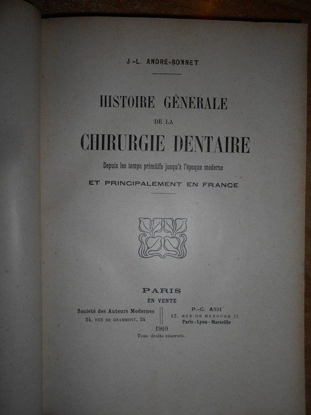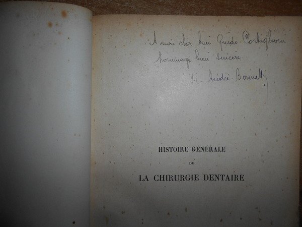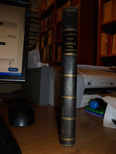 J.-L. André-Bonnet. Paris, Société des Auteurs Modernes, 1910. HISTOIRE Génerale de la Chirurgie Dentaire. Depuis les temps primitifs jusqu'a l' époque moderne et principalement en France. Edizione originale. In-8°, m. pelle coeva, fregi e titolo in oro al dorso. Occhietto con dedica firmata dall' Autore ad un amico. 318 pp. Bell' esemplare. Uff. C - IV - 6