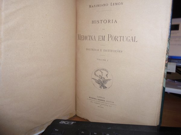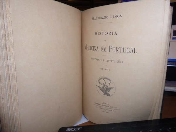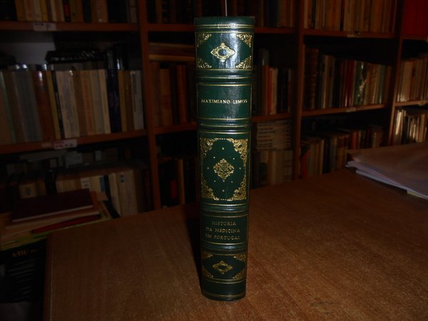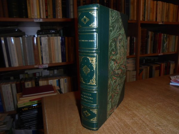 Maximiliano, Lemos. Lisboa, Manoel Gomes, 1899. Historia da Medicina em Portugal. Doutrinas e Instituições. 2 volumi in-8° legati assieme, bellissima legatura in m. pelle con larghe punte, dorso a nervi con fregi e titoli in oro. I. viii, 338 pp., 1 f. (note tipogr.); II. 402 pp., 1 f. (note tipogr.). Indice dei nomi compilato da uno studioso. (Esemplare unico) in magnifica legatura. Uff. C - IV - 6 - 2