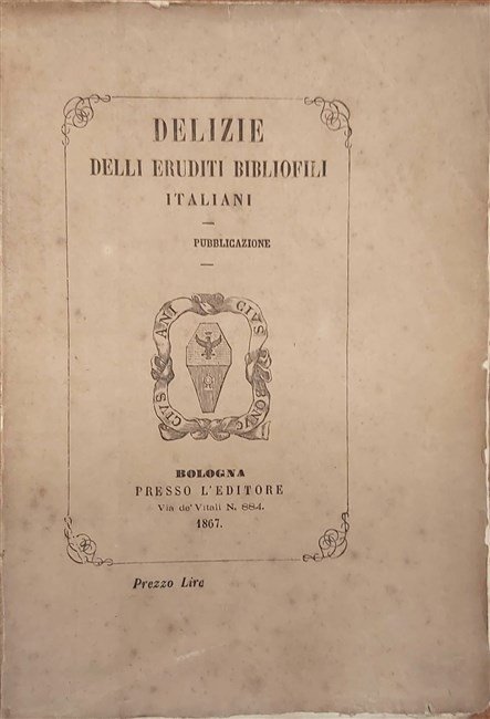 in-16, pp. XVI, 62, (2), bross. edit. L'operetta fa parte della collana diretta da Anicio Bonucci "Delizie degli eruditi Bibliofili italiani" in cui venivano pubblicate opere della letteratura italiana da antichi codici o pregevoli e rare edizioni di stampatori italiani, con particolare e raffinata attenzione prestata al carattere tipografico, carta, riproduzioni e fregi. A tiratura limitata di soli 200 esempl. num. (ns nr.116). Questo è l'ottavo fascicolo della collana. Bell'esempl. in barbe. [168]