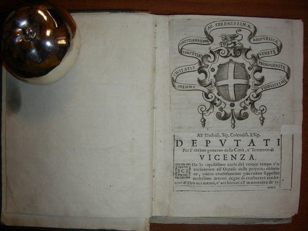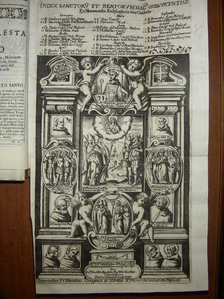6 parti in 3 gr. voll. in-4, pp. (24), 295, (2); (8), 298, (14); (16), 320, (8); XII, 429, (2); (4), 458, (2); VII, 209, (2), leg. ottocentesca cartone con doppio tass. in pelle ai d. con tit. e fregi oro. Splendido front. inc. in rame nei primi 3 libri, sempre differente, con figure di Santi e Protettori della città, pianta e veduta di Vicenza (piazza dei Signori e Porta Monte), stemma araldico della città in rame alla dedicatoria. Al primo libro doppio front. in rame e una gr. tav. rip. in rame con l’indice e i ritratti dei Santi vicentini in edicola barocca. Fregi, iniziali e final. xilogr. Le ultime 3 parti furono pubblicate postume, morendo l’A. nel 1656. I libri II e VI sono leggermente più alti dei restanti. Belliss. esempl. a larghi margini completo in ogni sua parte, di estrema rarità. [205]