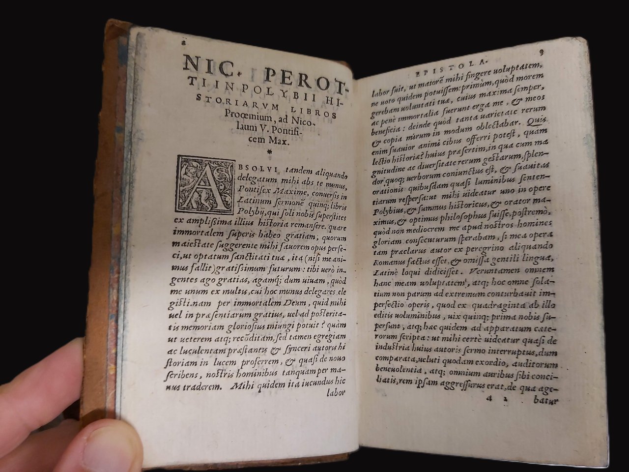 in-16, pp. 983, (45), 2 cb, leg. p. pelle coeva con tass. e tit. oro al d. con nervi. Segnalibro in seta cons. Marca tipogr. al front. Bella edizione dei primi 5 libri delle storie di Polibio con il commento di Nicolò Perotti, cui si aggiungono le Epitomi curate dal monaco benedettino e riformatore luterano Wolfgang Müslin, per il quale l'antico proprietario del volume aggiunge una nota manoscritta accanto al suo nome al front. che cita "auctore damnato". Qualche dif. alle cuffie ma bell'esempl. [MM14-221]