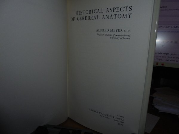 ALFRED MEYER. New York - Toronto, Oxford, University Press, 1971. Historical Aspects of Cerebral Anatomy. In-8°, tela edit. azzurra con titolo in oro al dorso, sovracopertina. ix, 230 pp. con illustrazioni in bianco e nero n.t. Libro come nuovo. Sovracopertina con lievissimi segni del tempo. Uff. C - IV - 3