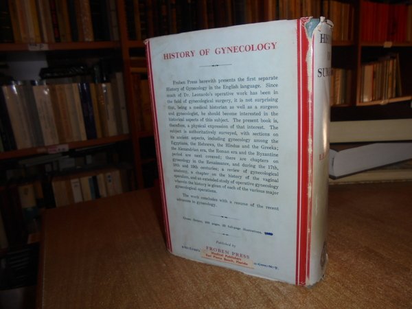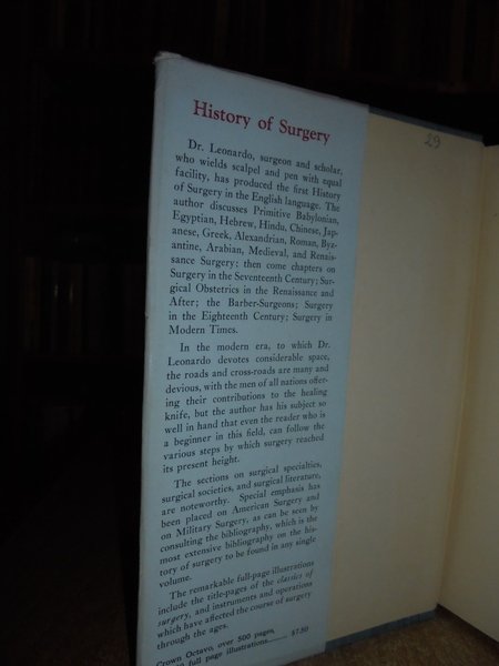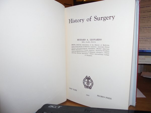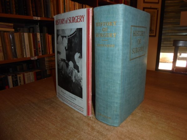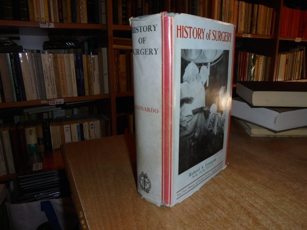 Richard A. Leonardo. New York, Froben Press, 1943. HISTORY of SURGERY. In-8°, tutta tela edit. contitoli in oro sul piano e al dorso, sovracopertina (con strappi). xvii, 504 pp. con 100 plate fuori testo. Strappetti nella sovracopertina ma libro in ottimo stato di conservazione. Uff. C - IV - 4
