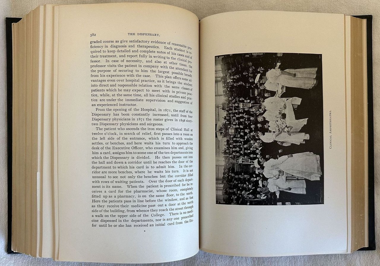 Rara opera del 1898, la storia dell'"Homeopathic medical College" della Pennsylvania e "The Hannemann Medical College and hospital" di Philadelphia scritto da Thomas Lindsley Bradford (1847-1918) medico omeopata e storico della omeopatia. Praticò l'omeopatia nel Maine, in Europa e a Philadelphia, duramte la sua carriera fu autore di numerose pubblicazione sulla materia. La prima parte dedicata alla storia e descrizione molto dettagliata dell'Ospedale con riferimento ai medici e gli incontri sull'omeopatia, studenti, dati amministrativi e finanziari, membri dello staff. Alla fine una parte dedicata alla Scuola di avviamento per infermieri, Farmacia, Maternità, Biblioteca, Alunni e lista dei laureati. Numerose tavole fotografiche fuori testo. Ex libris al contropiatto anteriore. In buone condizioni e completo. Copertina in tela editoriale in buone condizioni generali con lievi usure ai margini e dorso. Legatura in buone condizioni. All'interno le pagine si presentano in buone condizioni con fioriture. In 8. Dim. 23,5x16,5 cm. Pp. XVII+(3)+904. Peso Kg. 1,800Scarce work of 1898, the history of "Homeopathic medical College" of Pennsylvania and "The Hannemann Medical College and hospital" di Philadelphia written by Thomas Lindsley Bradford (1847-1918) medical physician and hystorian of homeopathy. He practiced homeopathy in Maine, in Europe and Philadelphia, during his carreer he was author of different contributes. The first part is dedicated to the history and very detailed description of hospital with refeerings to physicians and meetings about homeopathy, students, administrative and financial data, members of staff. At the end a part dedicated to Training school for nurses, Maternity hospital, Dispensary, Library, students and list of degreed people. Different photographic out of text plates. Ex libris in the front counterplate. In good conditions and complete. Cloth editorial cover in good conditions lightly worn in the edges. Binding in good conditions. Pages in good conditions with foxing.In 8. Dim. 23,5x16,5 cm. Pp. XVII+(3)+904. Weight Kg. 1,800
