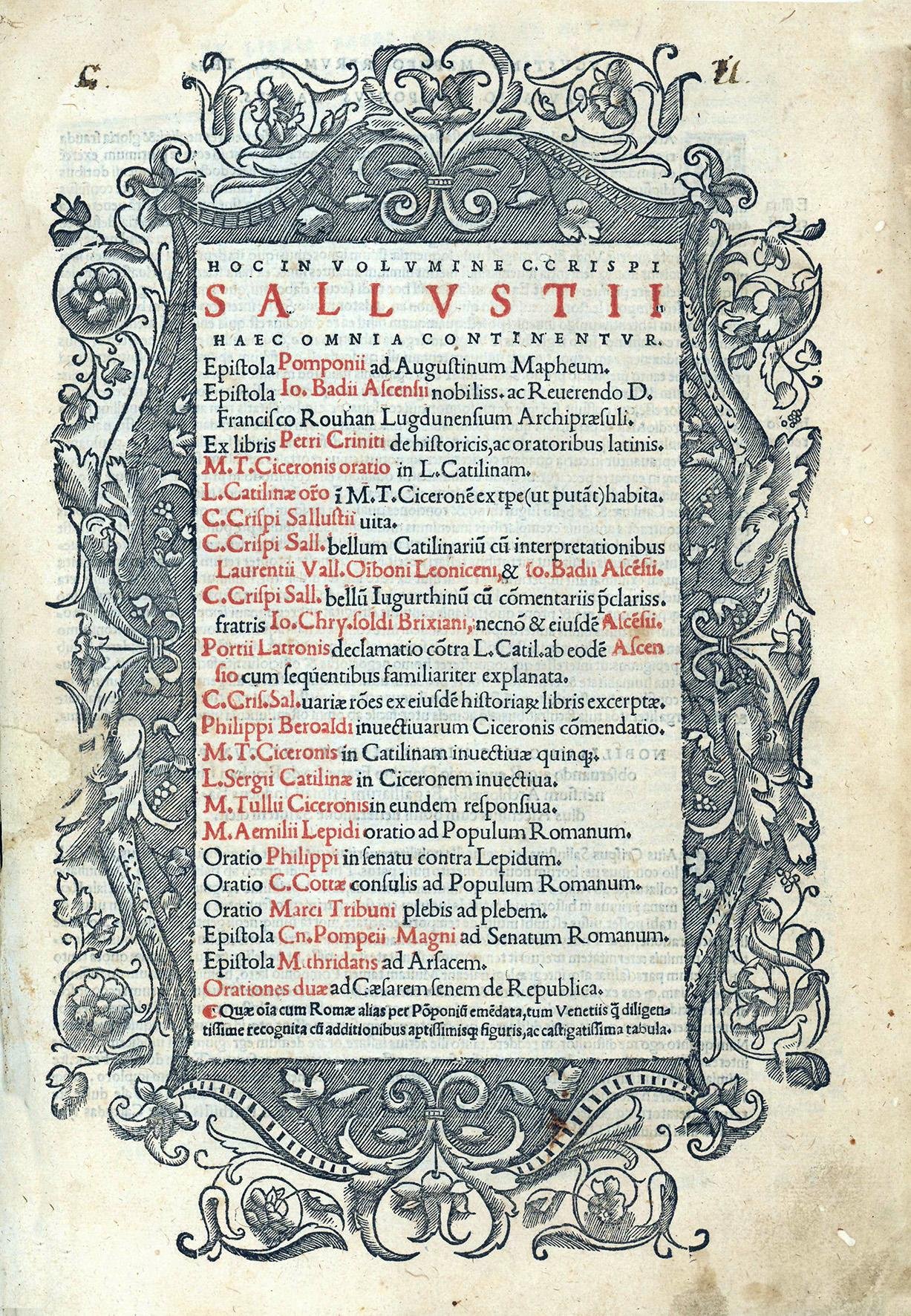 Hoc in volumine C. Crispi Sallustii haec omnia continentur. Epistola Pomponii ad Augustinum Mapheum. Epistola Io. Badii Ascensii [...] M.T. Ciceronis oratio in L. Catilinam [...] C. Crispi Sall. bellum Catilinarium cum interpretationibus Laurentii Vall. Omniboni Leoniceni, & Io. Badii Ascensii. C. Crispii Sall. bellum Iugurtinum [?] Quae omnia [...] per Pomponium emendata, tum Venetiis quam diligentissime recognita