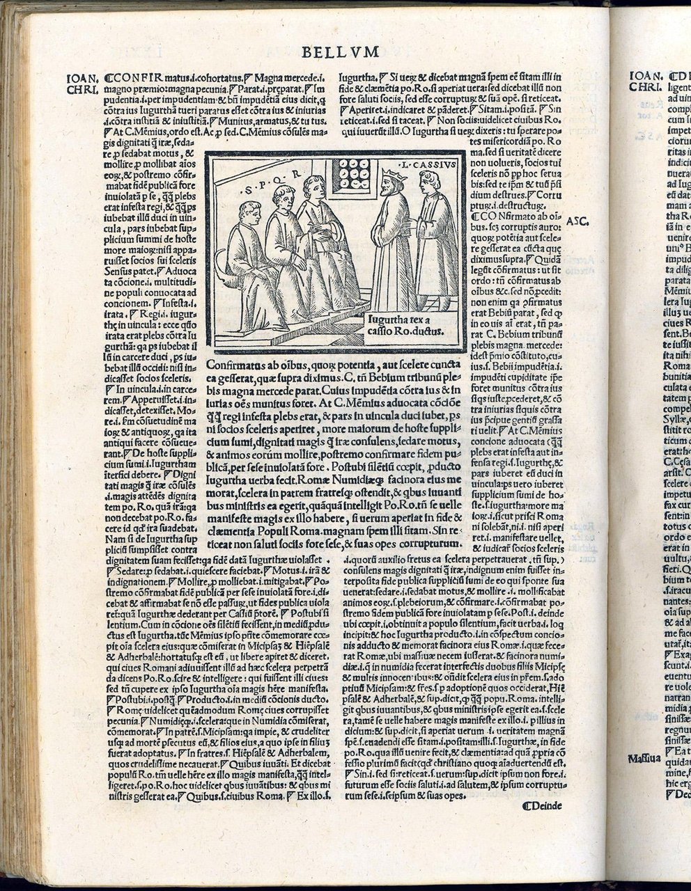 Bella edizione illustrata di Sallustio, che contiene il De coniuratione Catilinae con il commento di Lorenzo Valla, Ognibene Bonisoli e Josse Bade ed il De bello Iugurthino con il commento di Pomponio Leto. Le figure sono riprese dall'edizione Tacuino del 19 maggio 1511 (cfr. Essling, 47).