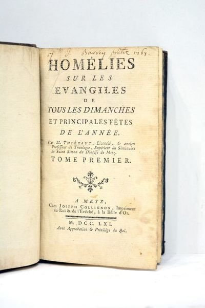 Tome premier seul. XXXIX. 423 pages. (16,5x10,5cm). Pleine basane du temps. Dos à nerfs décoré. Pièces de titre et tomaison maroquin. Filet doré sur les coupes. Tranches marbrées. Reliure légèrement usagée. Trou de ver sur la coiffe supérieure. Charnières fendues. Quelques frottements sur la reliure. Quelques rousseurs et salissures à l'intérieur. Travaux de ver à la marge droite avec perte de quelques lettres. Bon état intérieur par ailleurs. Jolie reliure de l'époque.