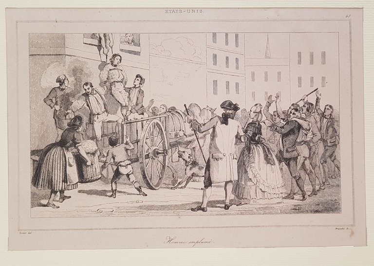 Veduta animata del 1838 circa che mostra una persona rapita montati in passepartout.Data: 1838 circa Tecnica: acquaforte Dimensione foglio: 17,5x25 cm Dimensione incisione: 11,5x17 cm Condizioni: Buone. Rare fioriture.Nice view of a kidnapped fellow in USA of 1838 circa mounted in a passepartout. Author: Branche after Vernier Date: 1838 circa Technique: Steel etching Passepartout Dimension: 17,5x25 cm (6.9x9.8 inches) Engraving Dimension: 11,5x17 cm (4.5x6.7 inches) Conditions: Good conditions. Some foxings.