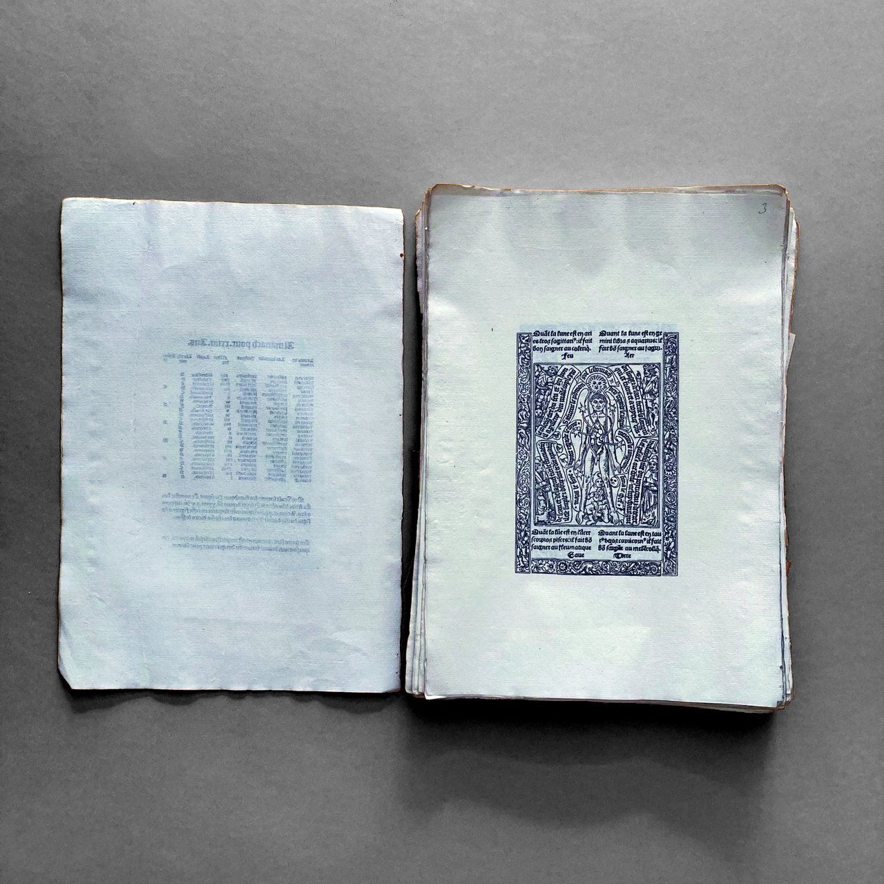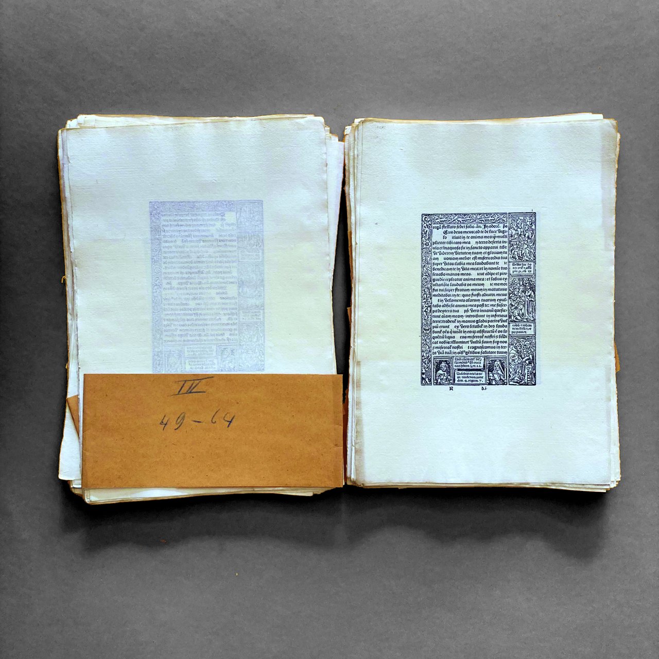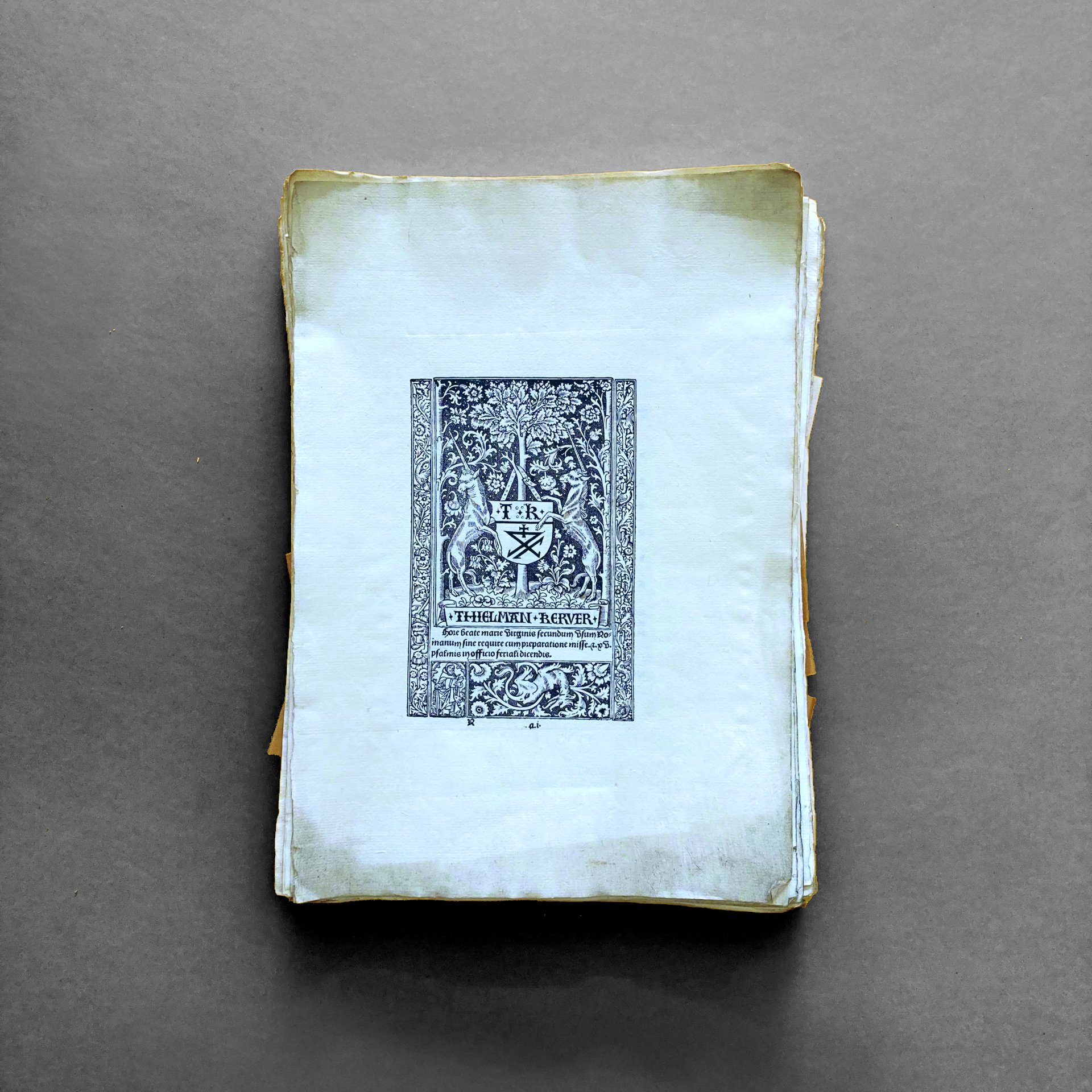 Curiosa e raffinata riproduzione artigianale di un noto libro d'ore, commissionata da un anonimo bibliofilo, probabilmente italiano, databile a cavallo tra XIX e XX secolo. Composto da 112 carte non numerate. Ogni foglio di cm29x20, l'incisione di cm 14x9. Conservato a fogli sciolti e in barbe. Il libro è stato stampato da una tipografia professionale su carta filigranata antica, con un procedimento che potrebbe essere quello litografico; tuttavia, la battuta sul foglio non è così evidente come dovrebbe essere per un'incisione su lastra, resta il dubbio che sia una composizione tipografica sperimentale non meglio identificabile, attuata con l'intento di replicare al meglio l'originale. Che si tratti di un tentativo di falsificazione o del capriccio di un bibliofilo, il reperto risulta essere di grande fascino sia per la bellezza del libro che per la modalità di riproduzione. Non ci sono noti oggetti simili nel mercato librario antiquario. Offerto insieme a un secondo tentativo di riproduzione, eseguito su fogli più piccoli e incompleto. Bibliografia: Gesamkatalog 13169.